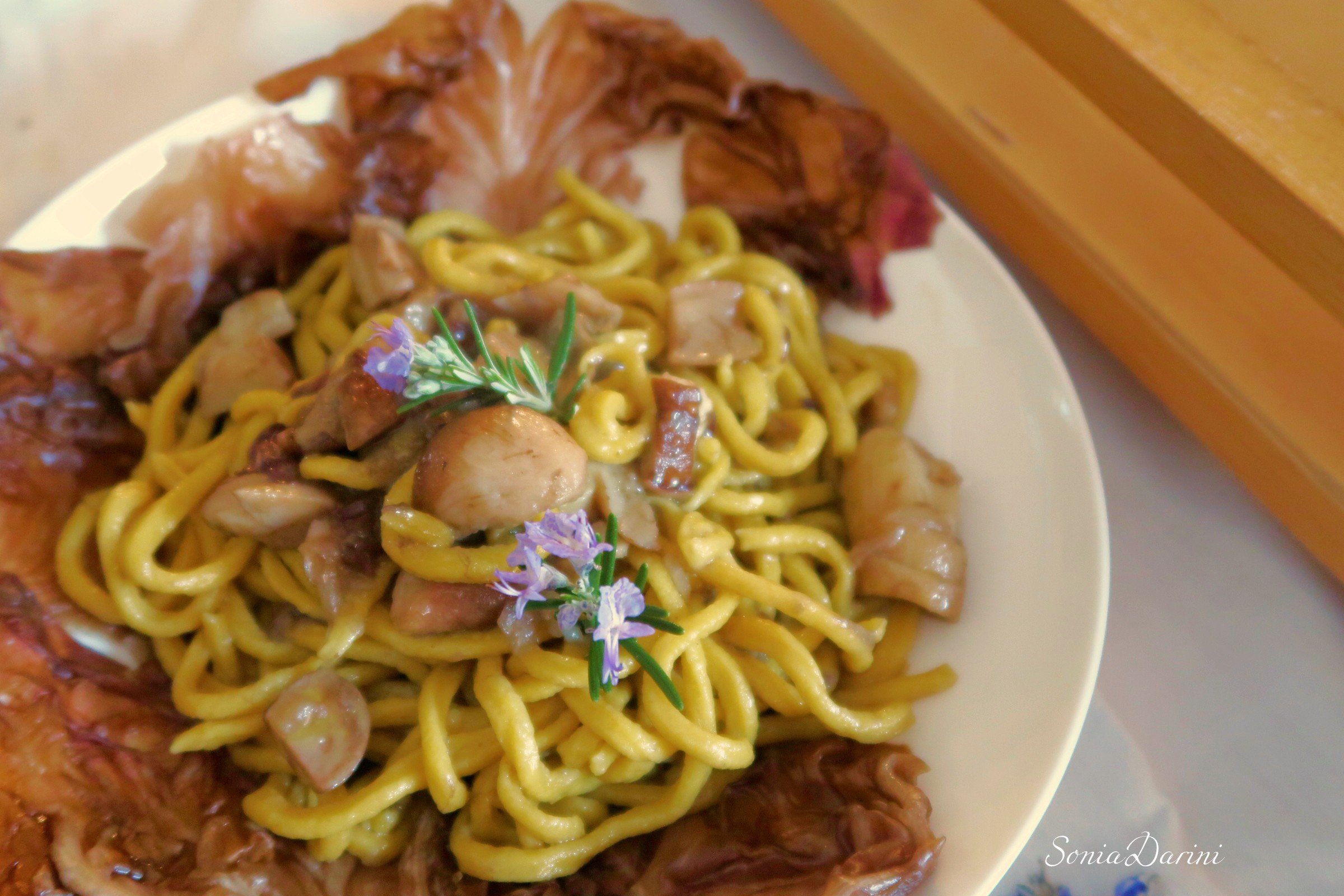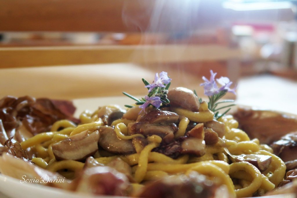 Ho preparato il condimento con olio d’oliva, uno spicchio d’aglio, funghi porcini tritati a cubetti, radicchio fresco a striscioline. Fatto cuocere con brodo di carne per circa 15 minuti. A cottura pasta, la versiamo nel condimento, spadelliamo e serviamo.