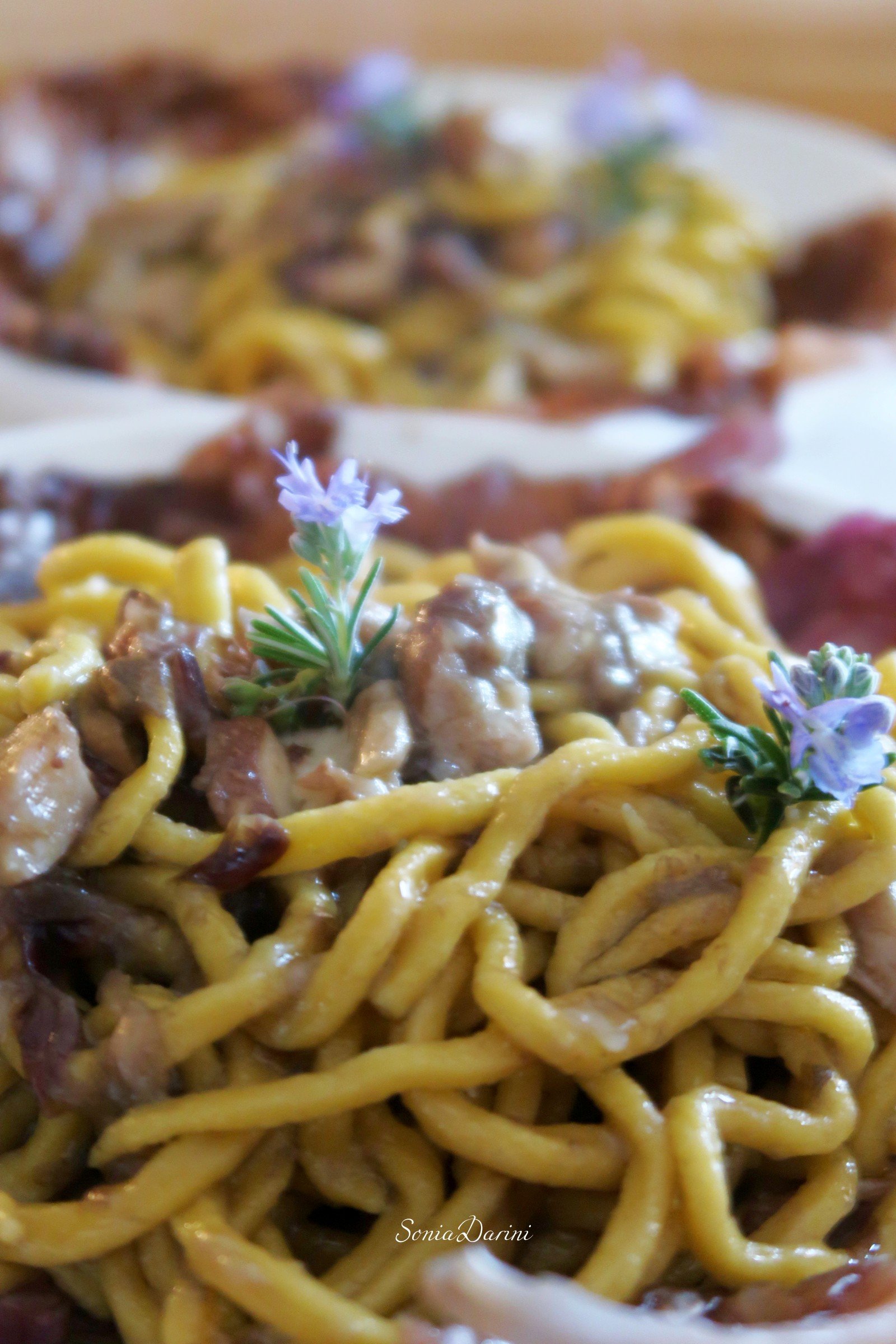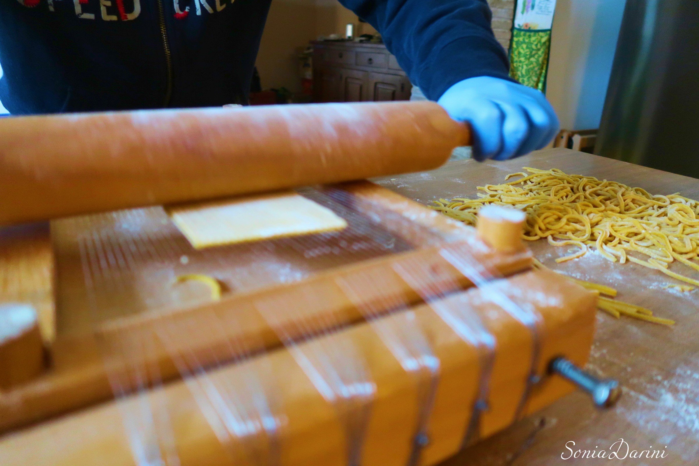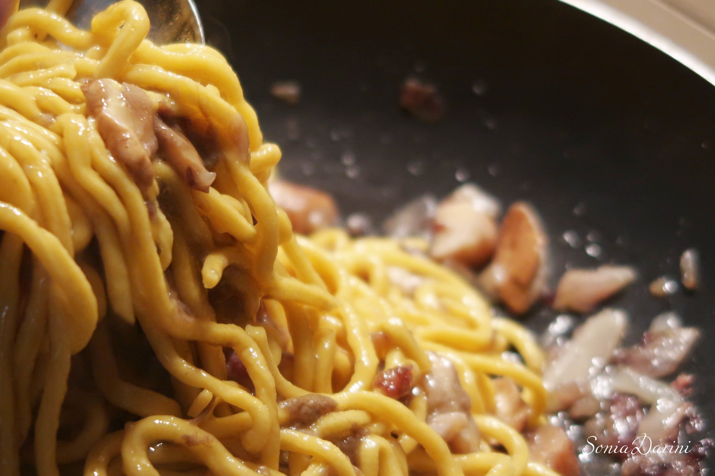 La particolarità di questa pasta è che prendono il loro nome dell’attrezzo con cui sono preparati, la chitarra, che conferisce loro la consistenza porosa che consente di amalgamarsi perfettamente al condimento. È una pasta che si presta ad essere condita con sughi importanti di carne, cacciagione ed io aggiungo pesce. La cottura deve essere rigorosamente al dente.