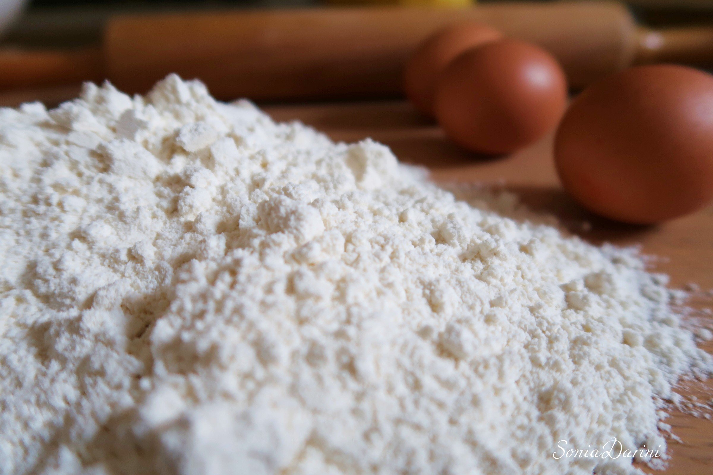 Versare sulla spianatoia 300 g di farina tipo 0 oppure semola di grano duro. Fare la fontana ed al centro rompere 3 uova. Sbattere con una forchetta ed aggiungere la farina dalla fontana. Formare una palla e lasciare riposare coperta con un piatto o pellicola. Formare la sfoglia, che deve essere di uno spessore di circa 5 mm. Tagliare a strisce di circa 10 cm di larghezza. Mettere ogni striscia sulla chitarra ed aiutandovi con il matterello, tagliate.