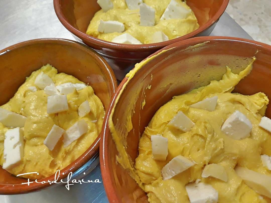 Tagliare a pezzetti il pecorino fresco, sistemare il composto nelle forme di terracotta e infilzare il pecorino a pezzi.