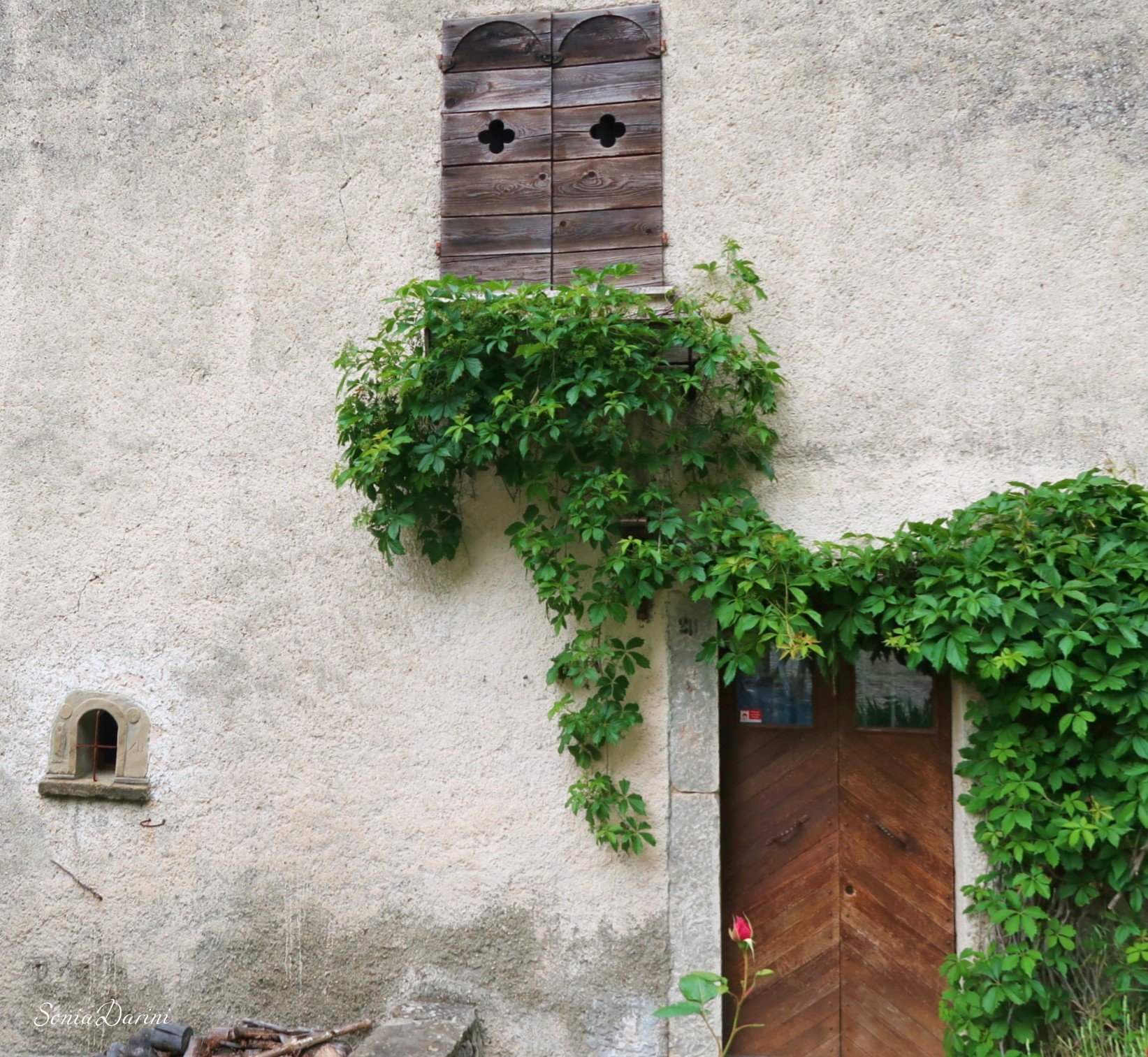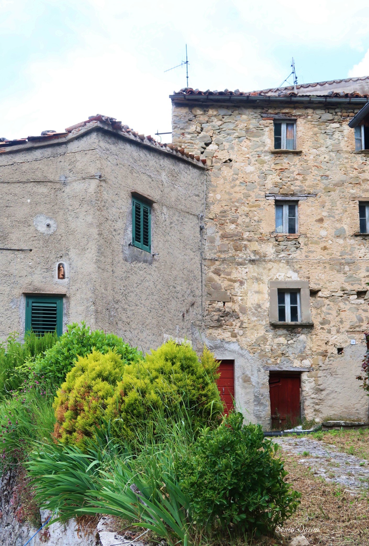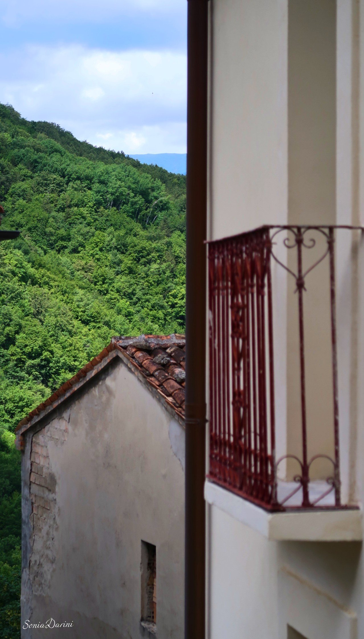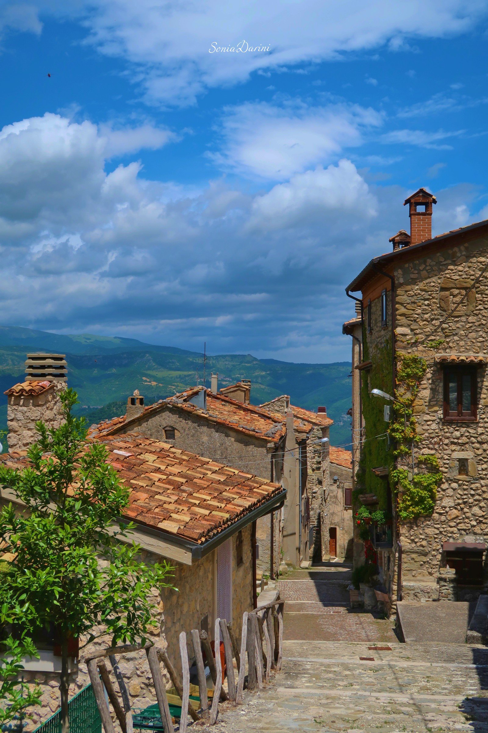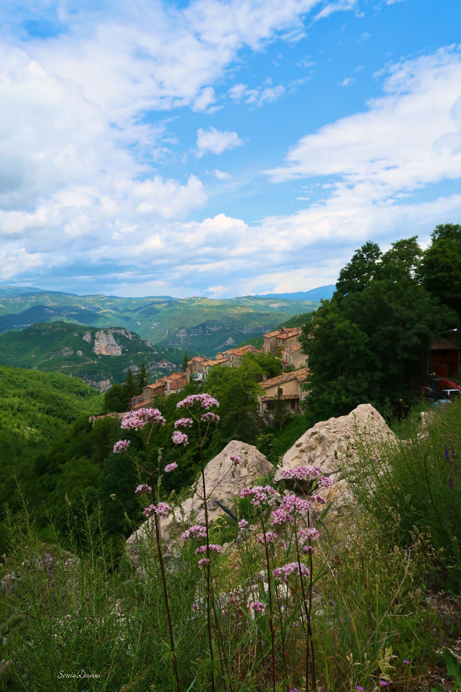 “Il paese è fatto di pietra,acqua, aria, neve, braci dentro i camini, silenzio e profumi. Lo scroscio di una cascata accompagna il cinguettio degli uccelli. I massi che incombono sul borgo sembrano giganti buoni a protezione del silenzio”.