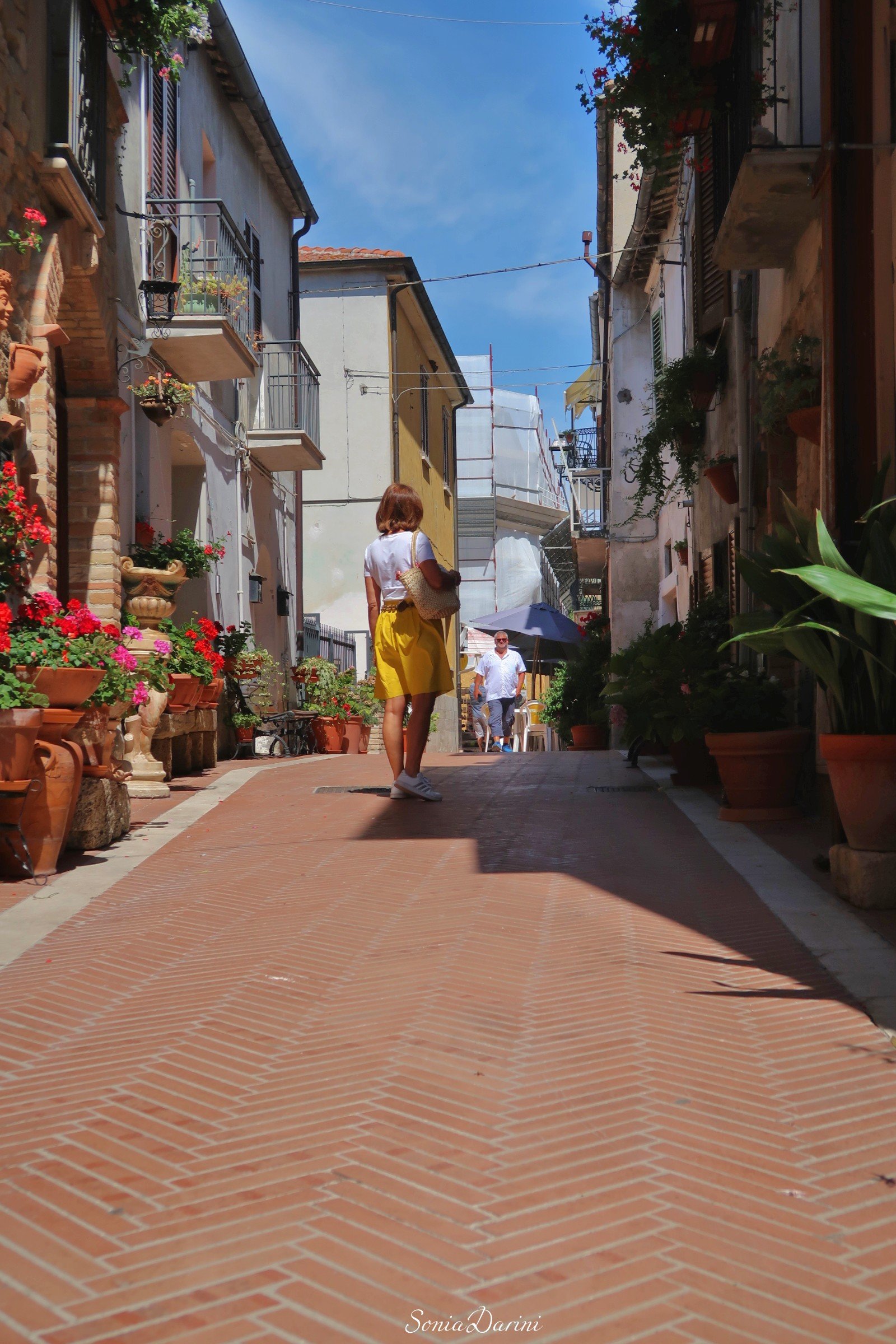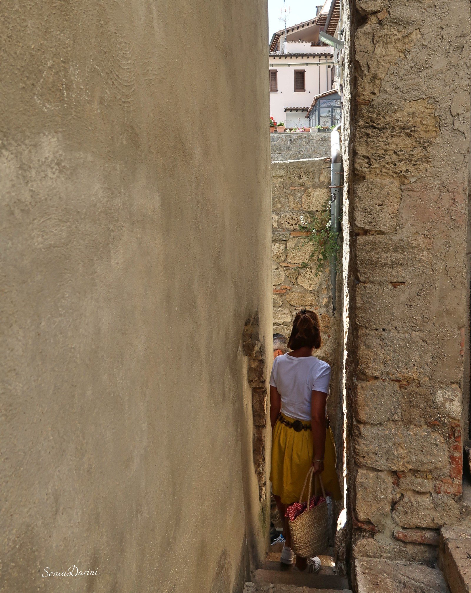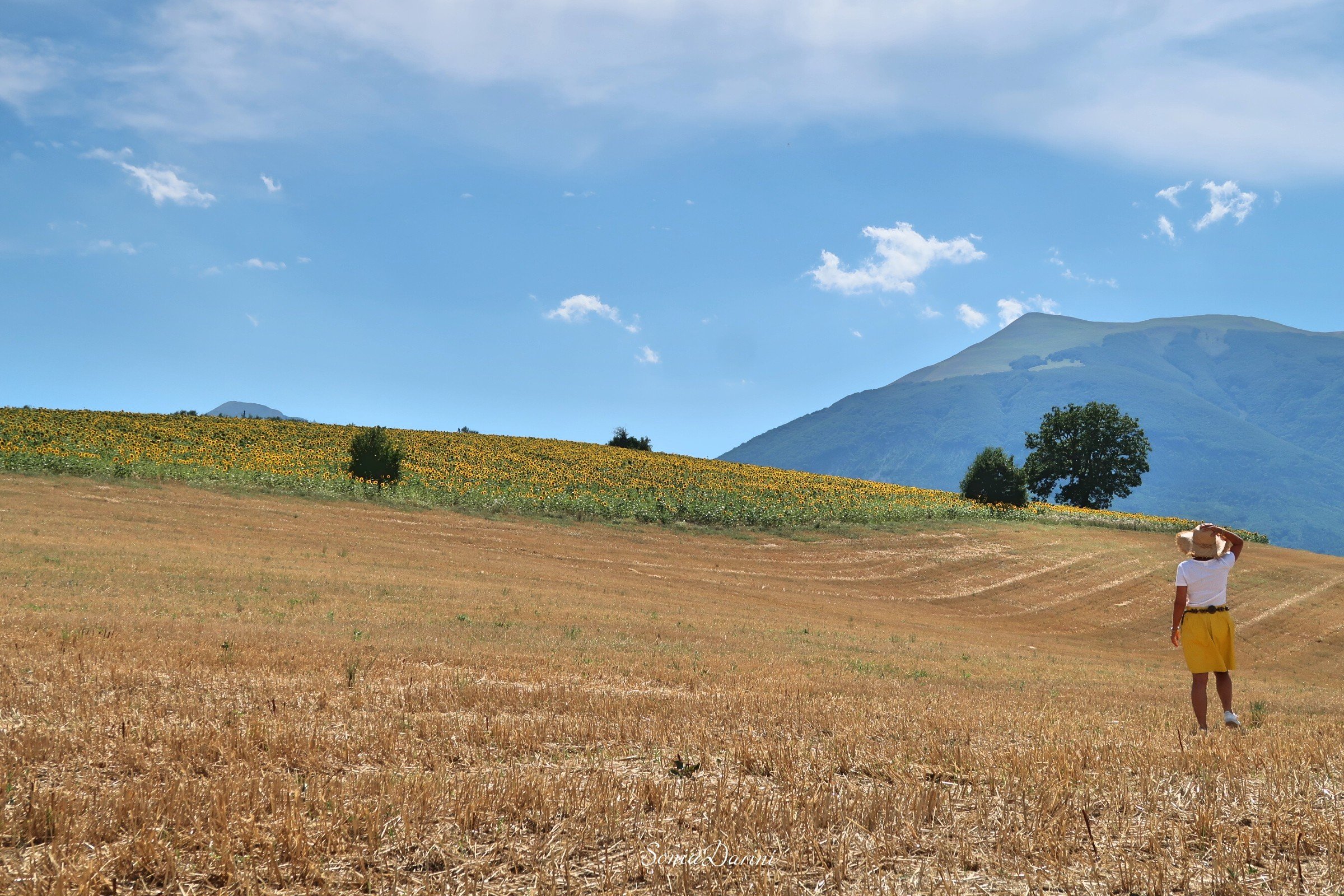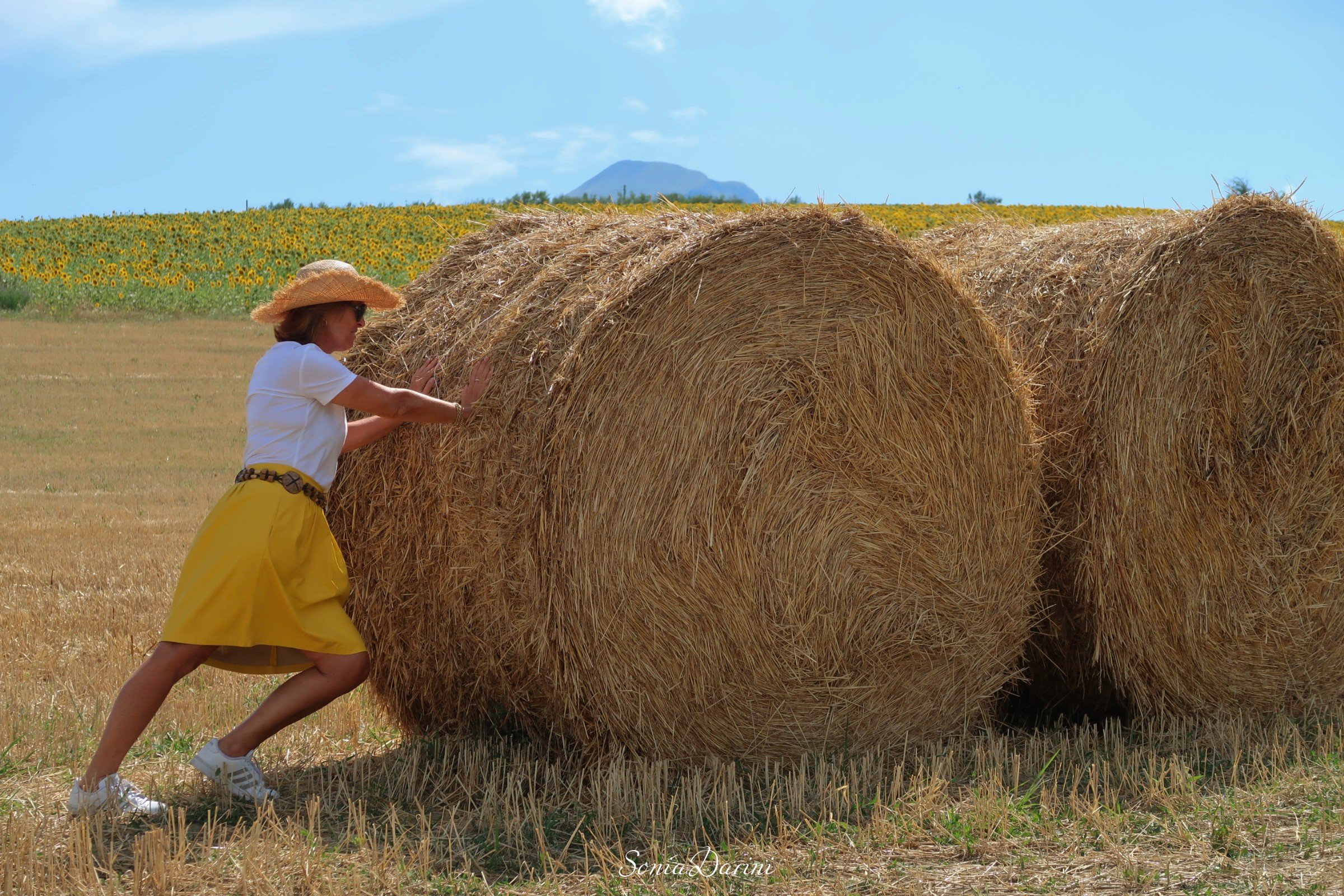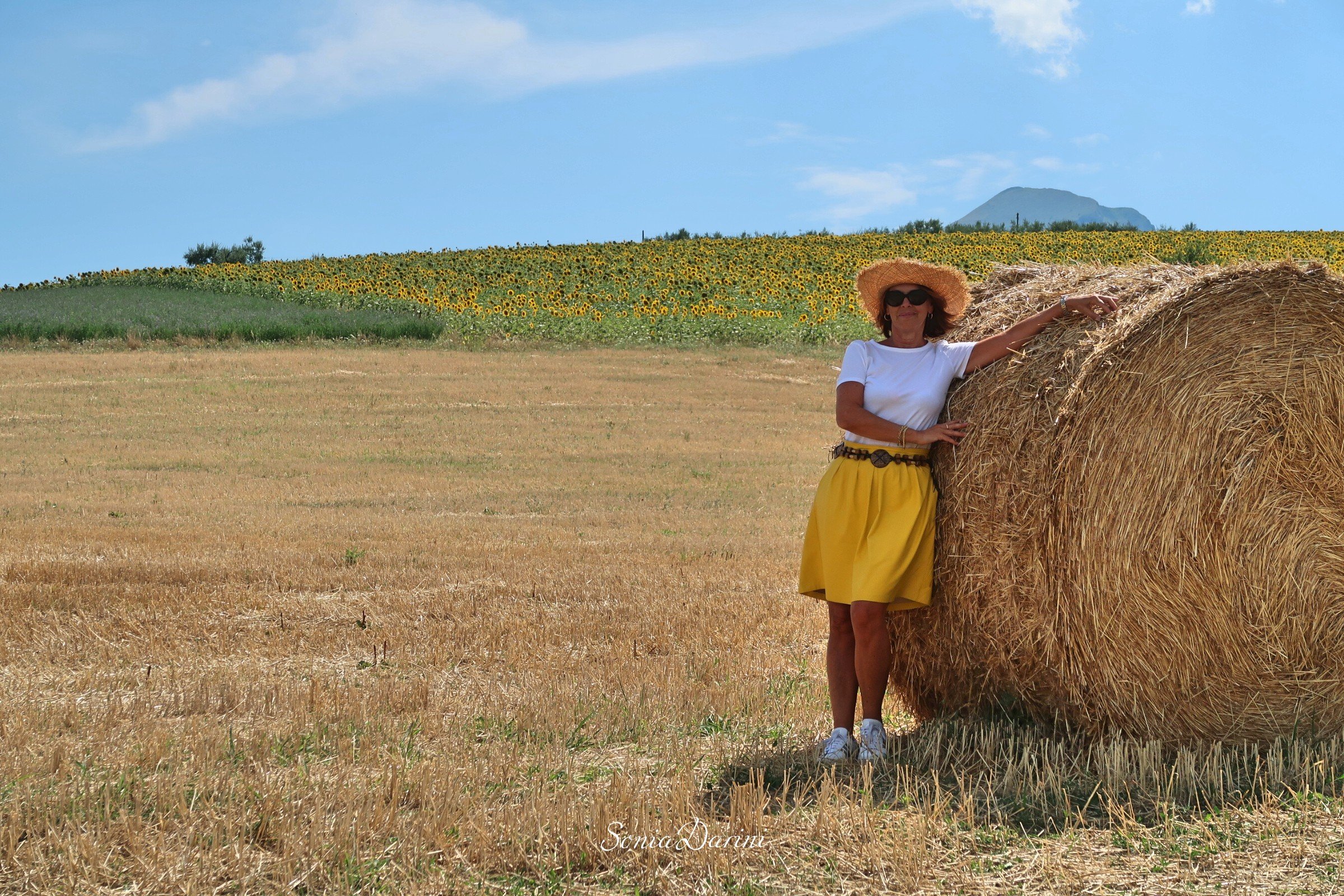 Nelle campagne scorci unici, colline coperte di coltivazioni tipicamente estive. Uno in particolare ha richiamato la nostra attenzione durante il ritorno. La mia amica Mariella oggi indossava una gonna di colore giallo, il cappello sempre pronto in macchina, ha reso il set fotografico perfetto.