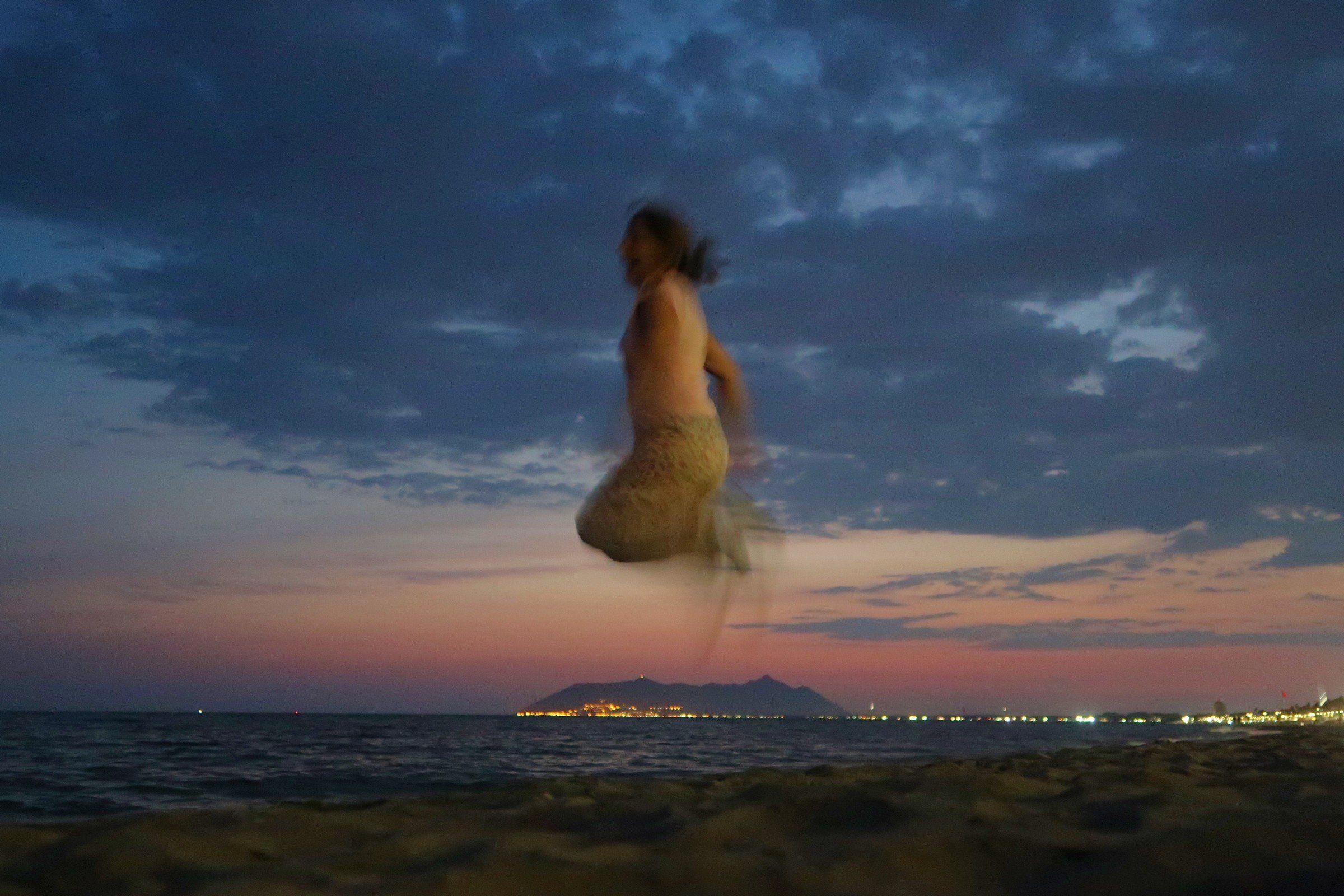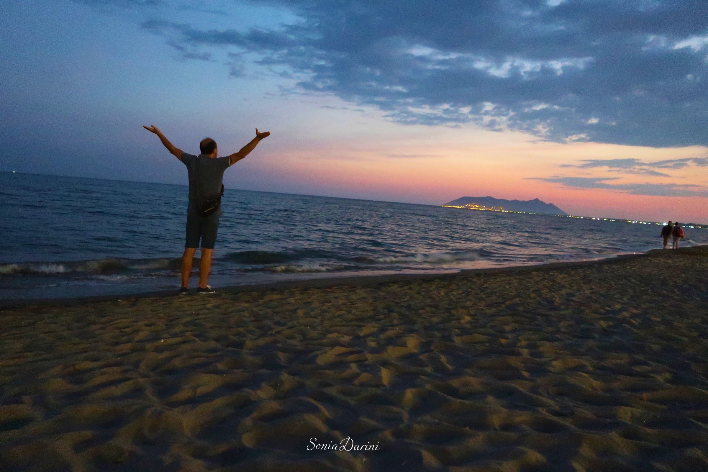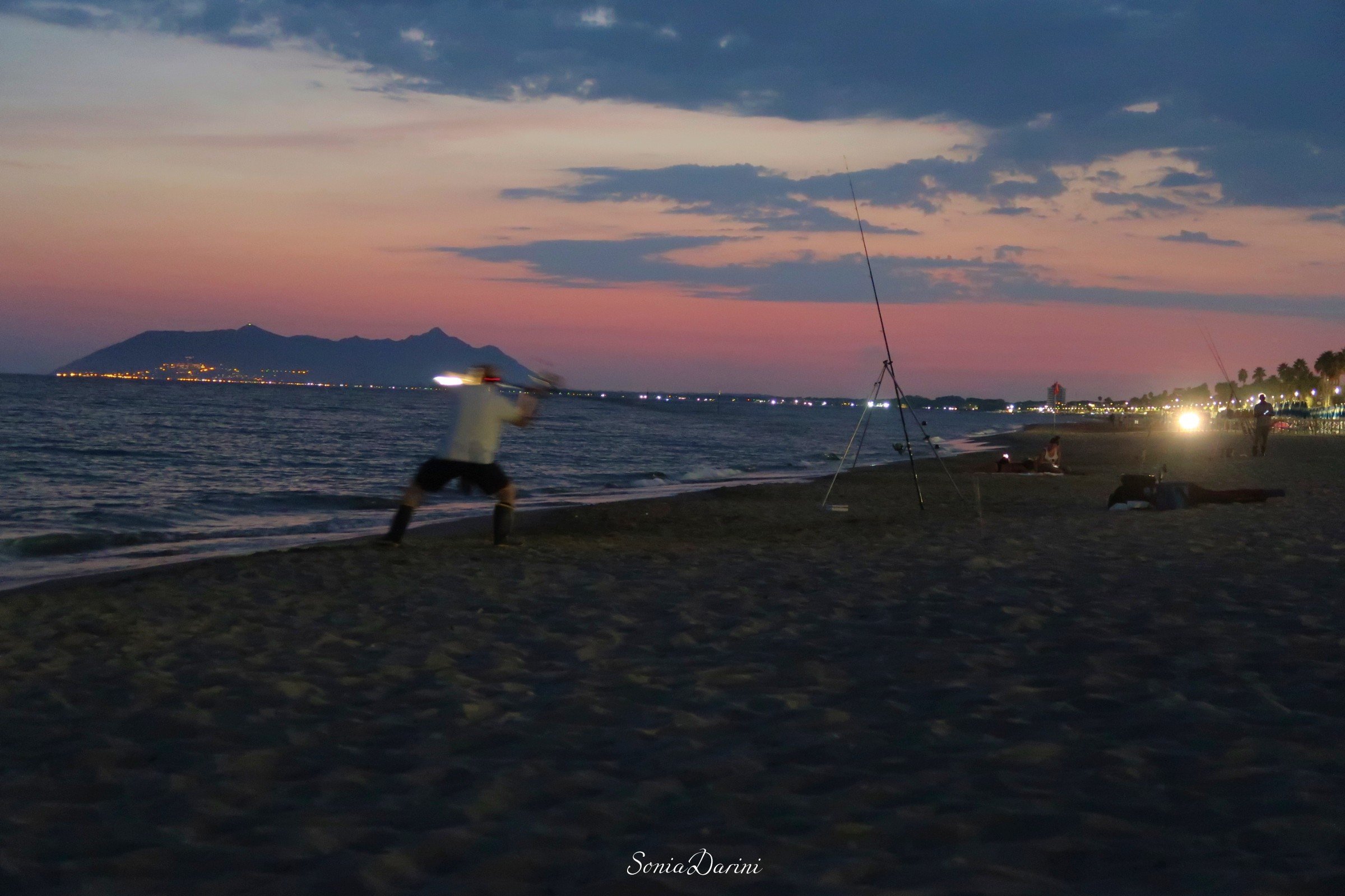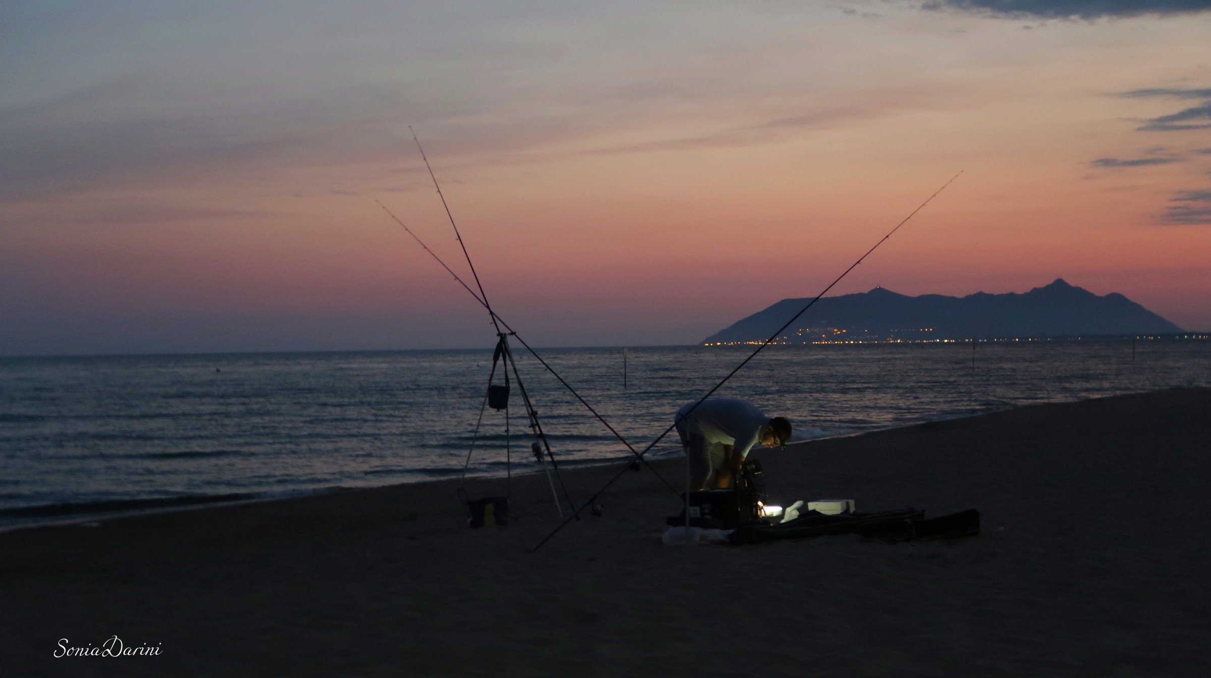 Poi l’ho visto andar via dietro al Circeo, dalla spiaggia di Terracina. Un tramonto rosa acceso che si è integrato alla perfezione con l’azzurro terso del cielo e il blu notte del mare. A completare l’immagine, mi ha dato una grande mano un pescatore che stava preparando la sua attrezzatura per la pesca notturna