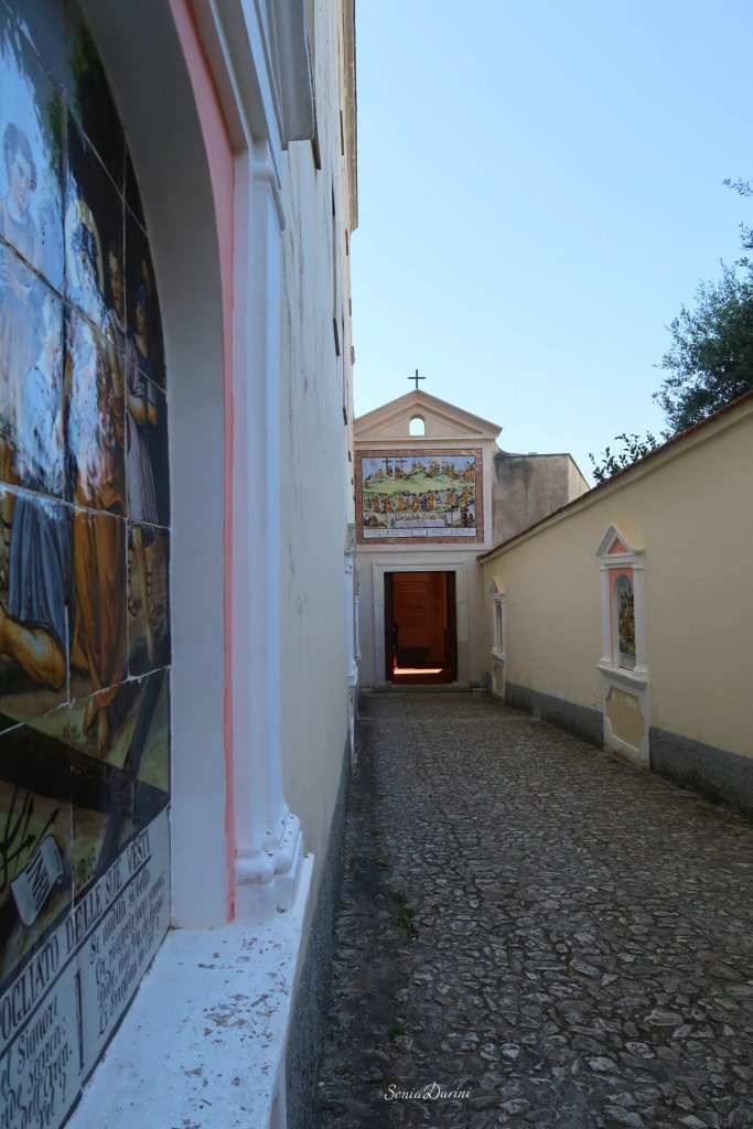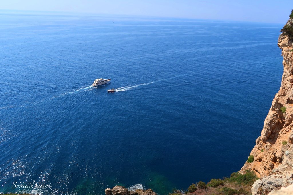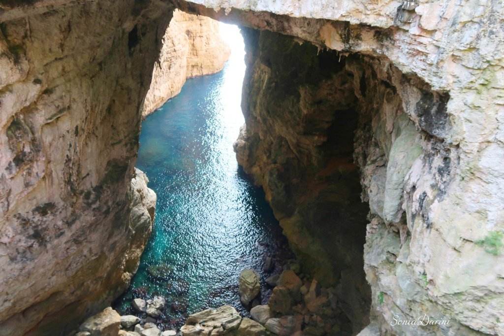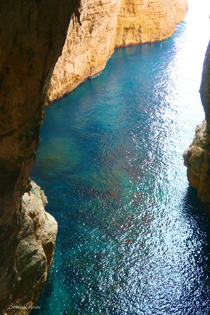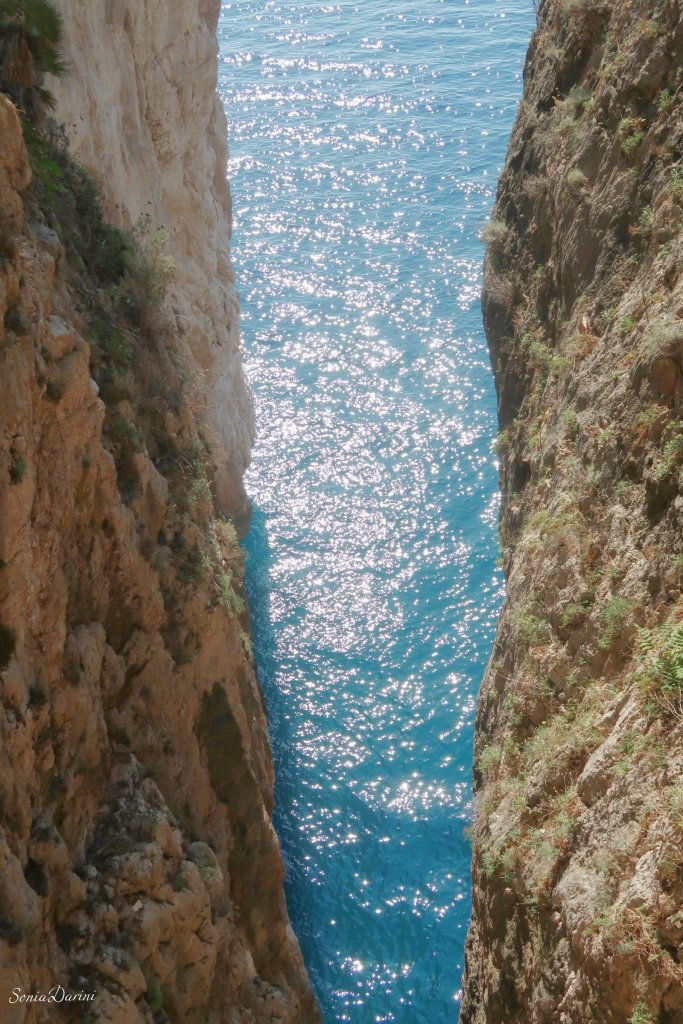 Qui si cammina nella roccia fino a una piccola chiesa incastonata in uno dei punti in cui, la leggenda narra, la terra si spaccó alla morte di Gesù. Il mare visto da qui, è una V blu.