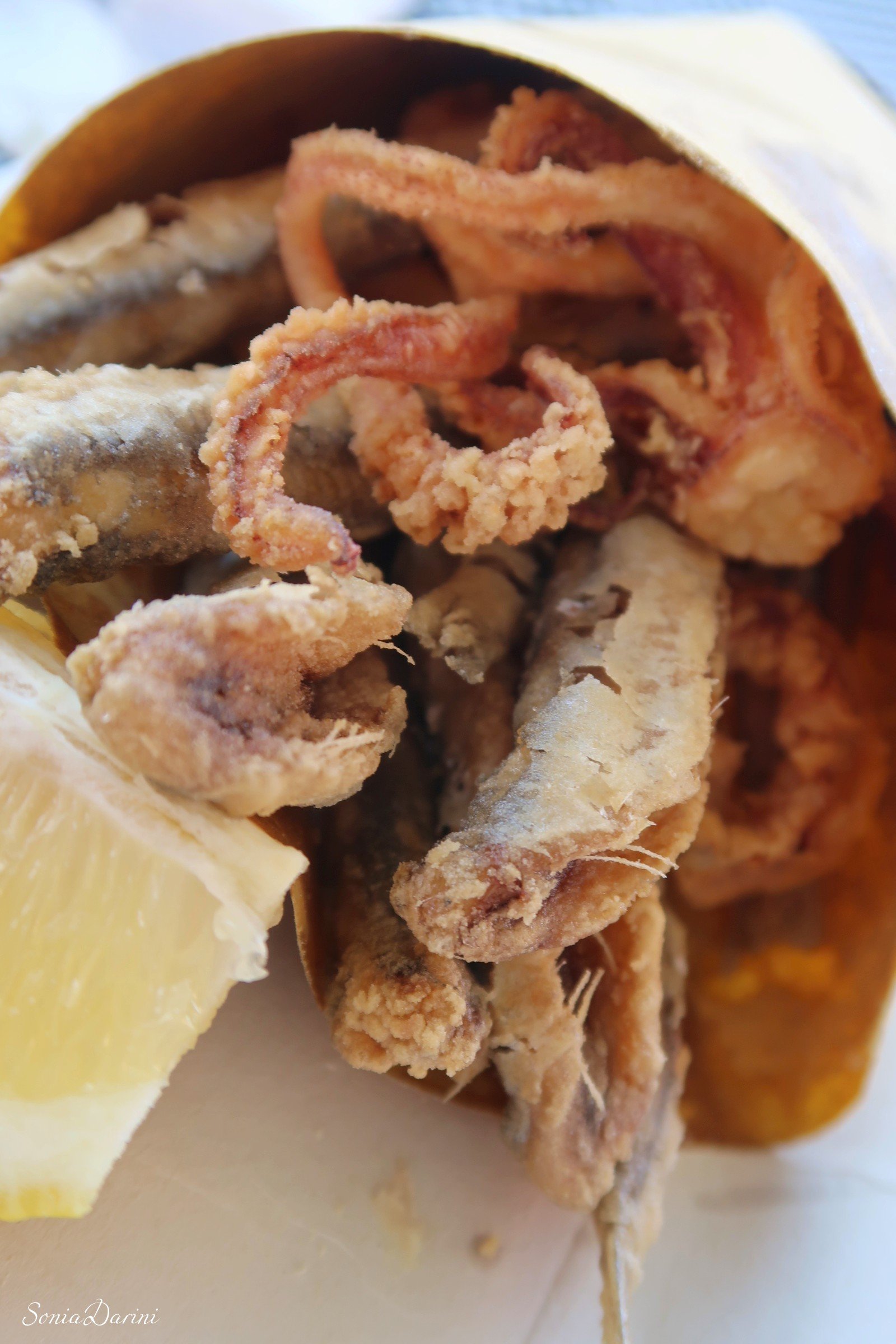 Ma prima di visitare questa parte antica della città, decidiamo di fare una piccola pausa in una friggitoria. Con un Cuppitiello di pesce misto, zeppole di alghe, linguine al polpo ristoriamo il nostro appetito.