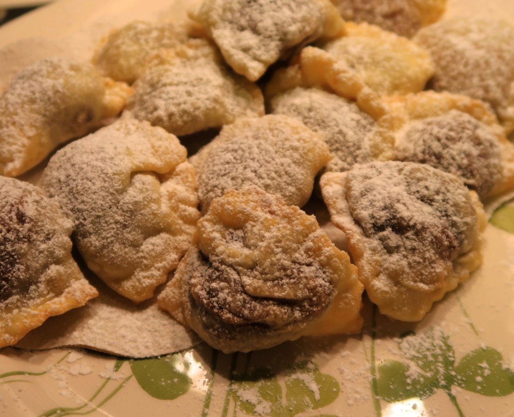 Nell’ascolano è consueto preparare i ravioli. Ripieni di gallina e spolverati con zucchero e cannella, oppure di castagne e cioccolato o di ricotta con tanta cannella e liquori. Sono fritti o lessi.
