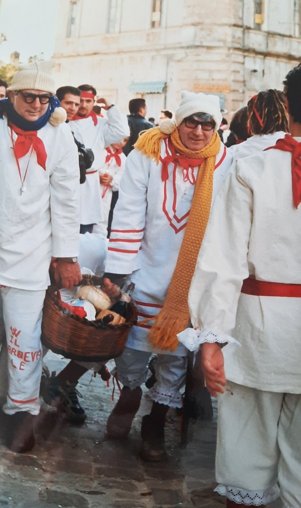 Qui sempre mio padre e i suoi amici il giorno de lu bov fint mentre girano per il paese con una cesta piena di salsicce e formaggio pecorino, vino