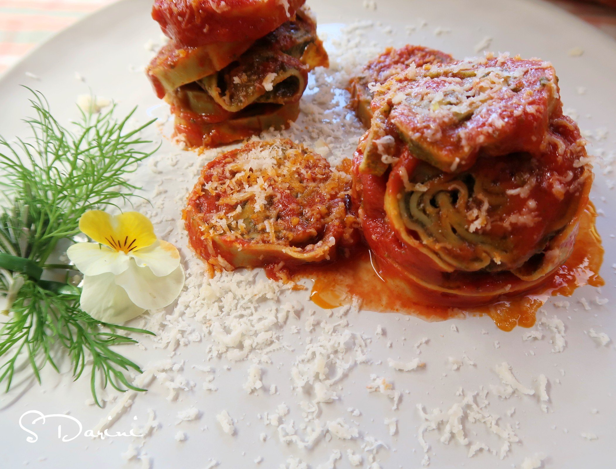 Per motivi di praticità, io preparo i rotoli il giorno prima e una volta cotti li conservo in frigo. Li taglio al momento e li condisco con il sugo.