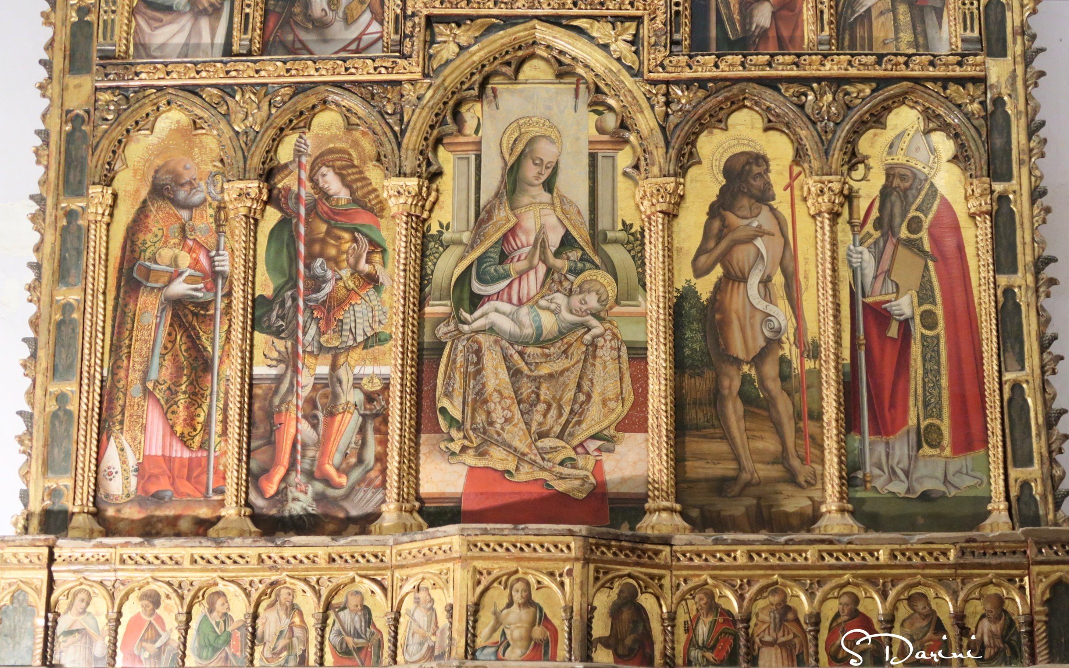 Carlo Crivelli fu molto apprezzato dalle committenze religiose marchigiane che gli ordinarono centinaia di immagini sacre da lui realizzate con elevata professionalità; molto eloquente il suo impressionante realismo capace perfino di turbare lo spettatore per la precisione dei tratti e molto accattivanti le tinte delle sue tele, ottenute utilizzando colori a tempera molto rari per quell’epoca. Nel polittico realizzato a 4 mani con il fratello Vittore, si percepisce perfettamente chi ha dipinto le singole parti.