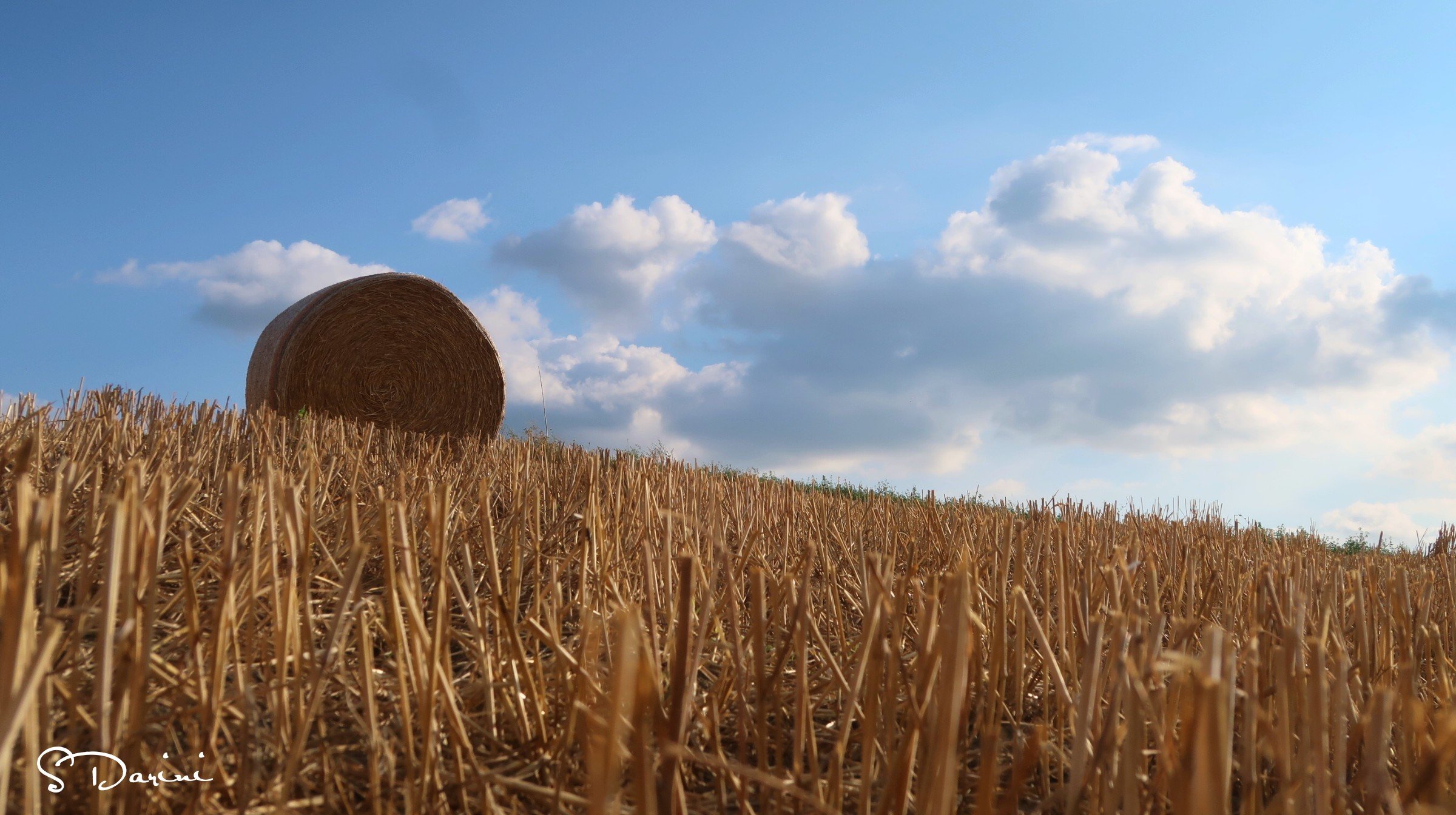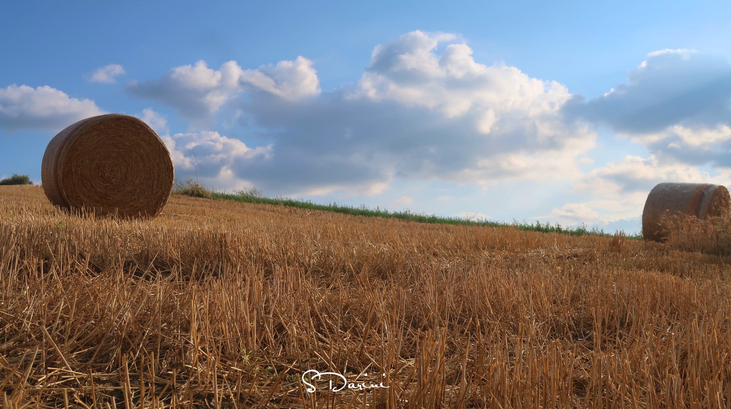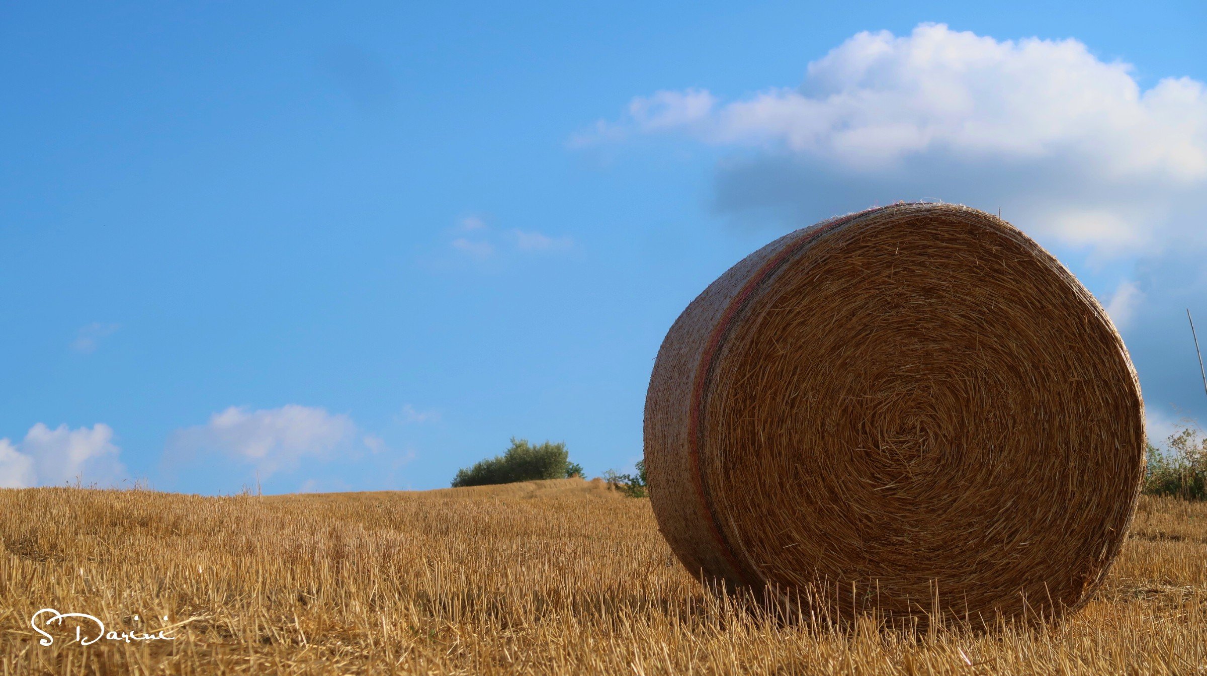 È domenica pomeriggio, il cielo è azzurro e le nuvole si incontrano fino ad abbracciarsi. È un armonia di colori, di profumi, di sapori, di sensazioni uniche. Il venticello caldo accarezza la pelle, la sfiora quasi a farla alzare. E la vista dei campi gialli, appena mietuti fanno sognare, sembra che tutte quelle balle possano rotolare da un momento all’altro fino a raggiungerci per fermarsi davanti a noi, sembra che tutto possa trasformarsi in un divertente gioco per adulti e bambini, dove la spensieratezza vince su tutto il resto!