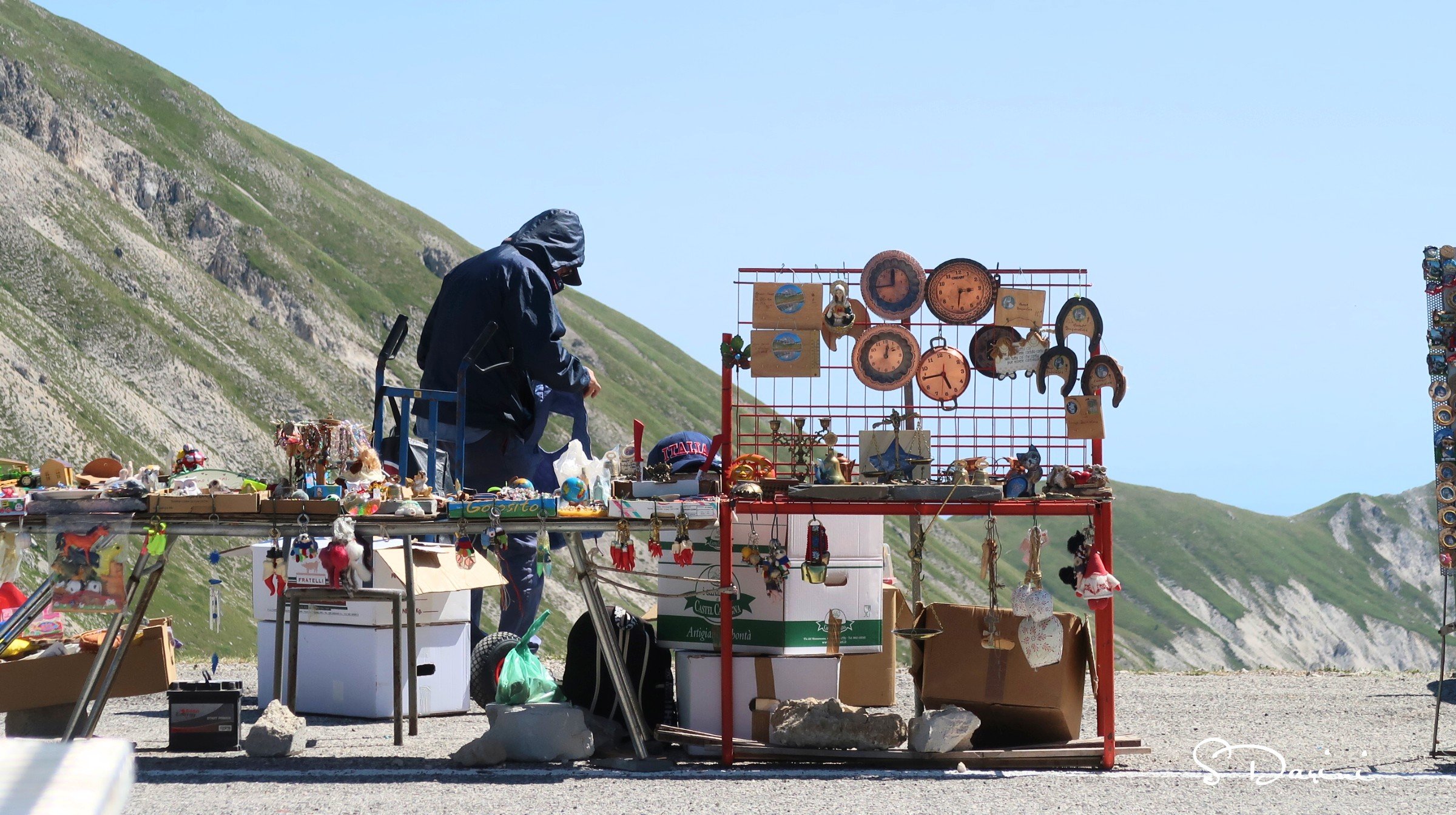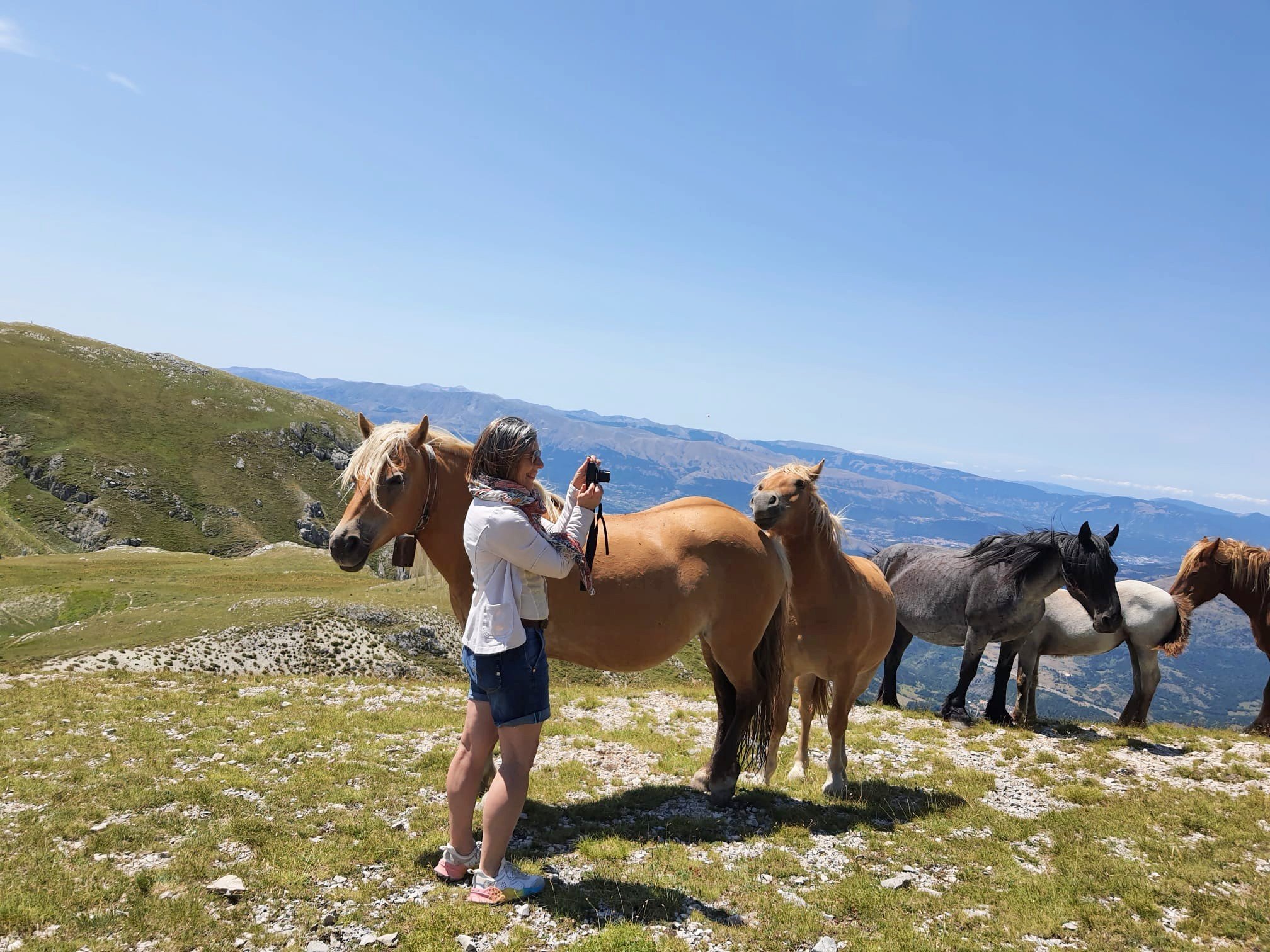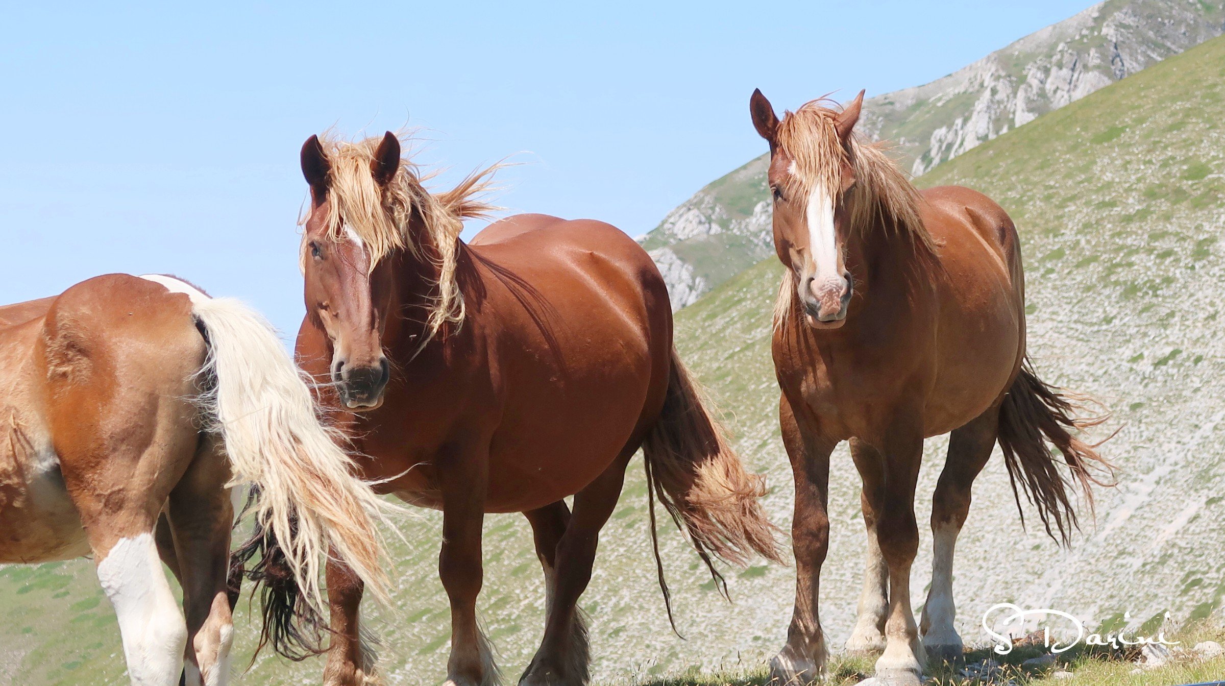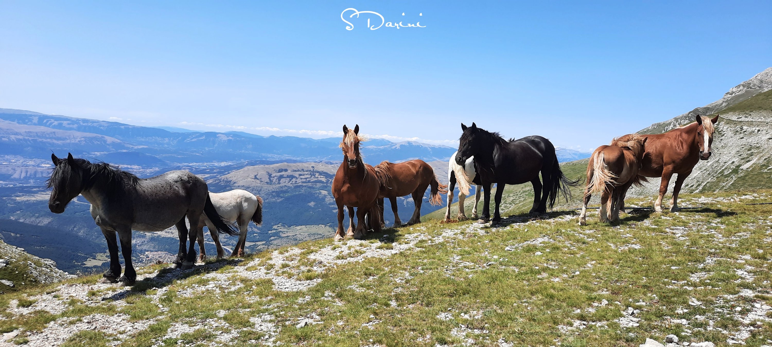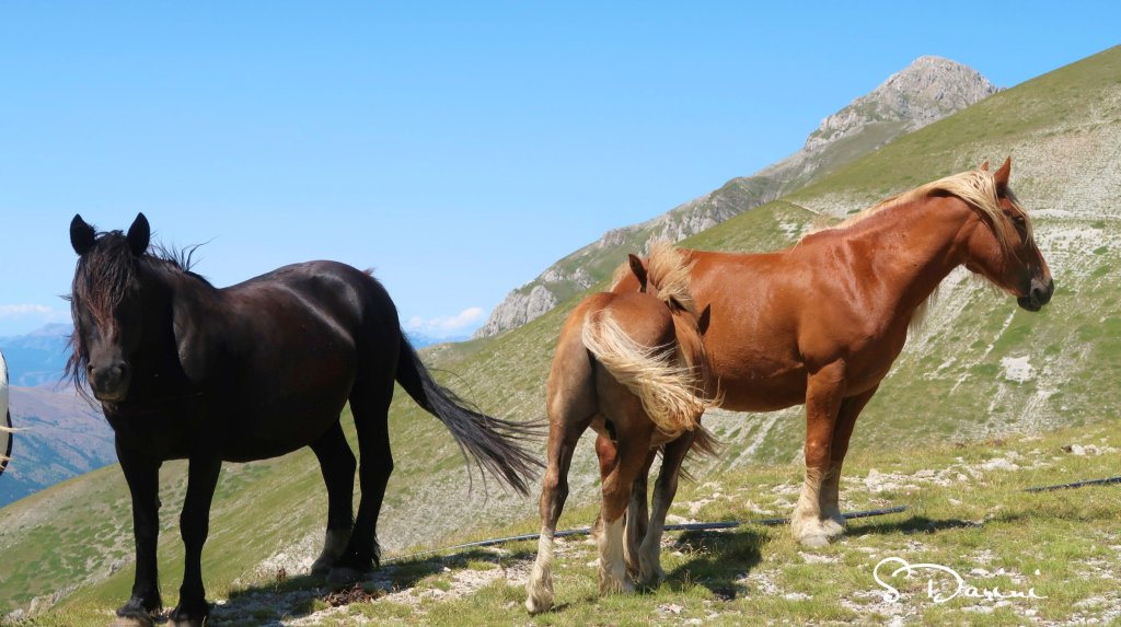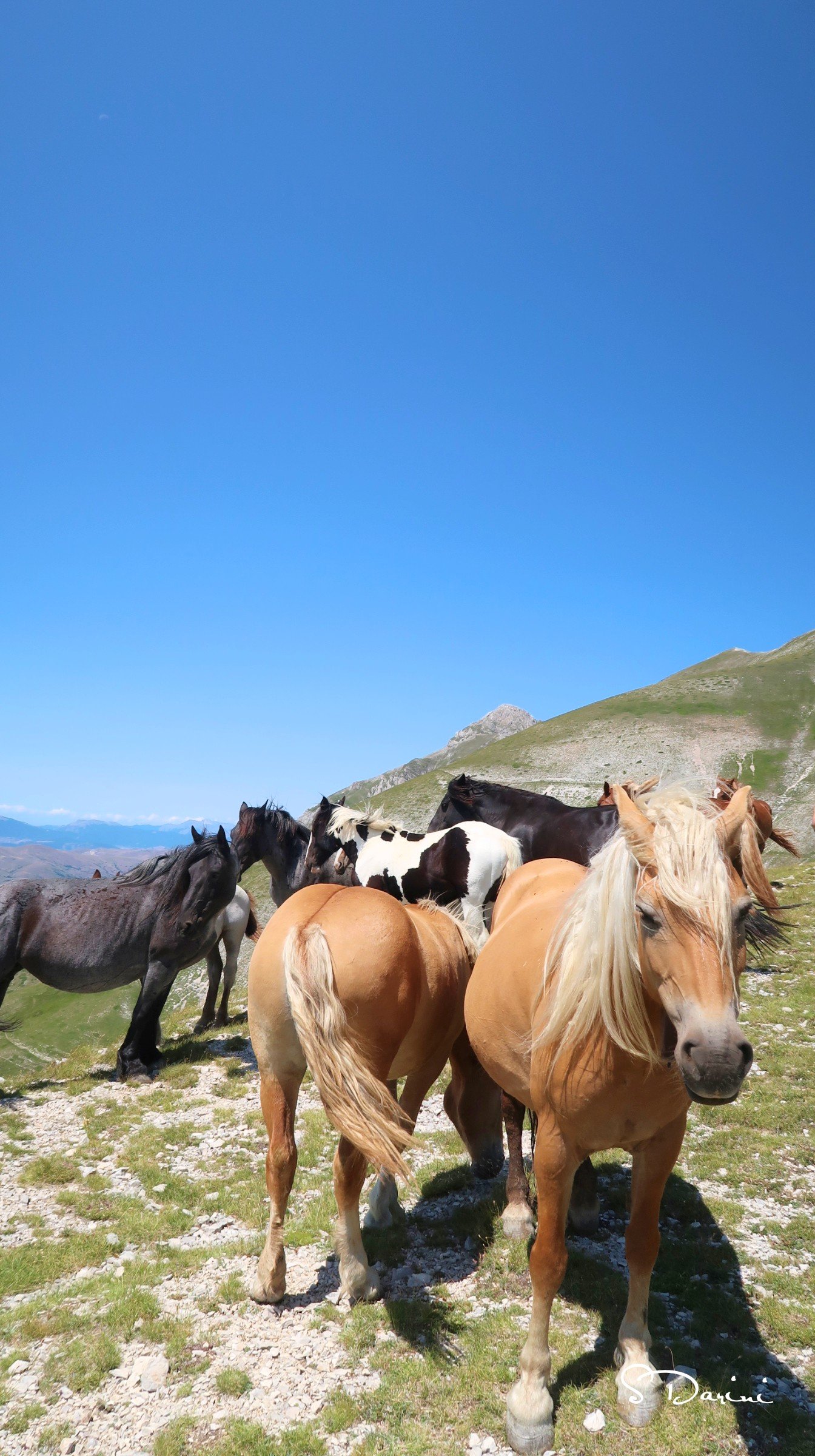 La strada per raggiungere campo Imperatore si fa sempre più stretta e curvosa, il guidatore deve fare molta attenzione a non farsi distrarre dallo scenario che sta attraversando, è lo scenario di un film. Ad un certo punto non si sa più dove guardare, mucche al pascolo, laghetti, greggi di pecore con pastore e in cima lo spettacolo più emozionante, i cavalli, tanti ma davvero tanti, immobili ad osservarci mentre noi li osserviamo, nella loro immensa grazia di movimento; i puledri che prendono il nutrimento dalle loro mamme, lo stallone attento ad ogni movimento. A fare da padrone su tutto il vento, oggi fresco e forte, ma assolutamente gradevole dopo la grande afa di questi giorni.