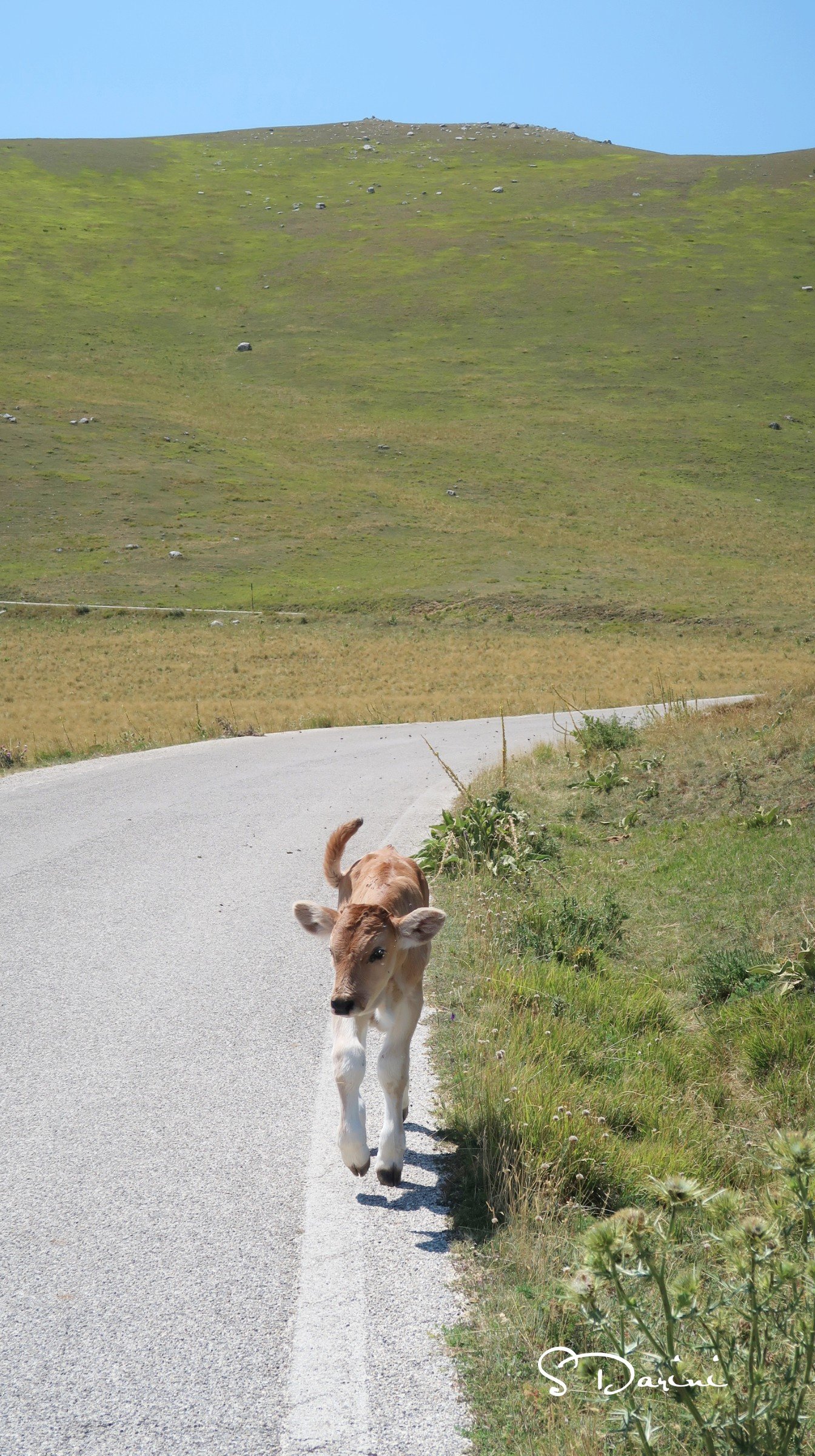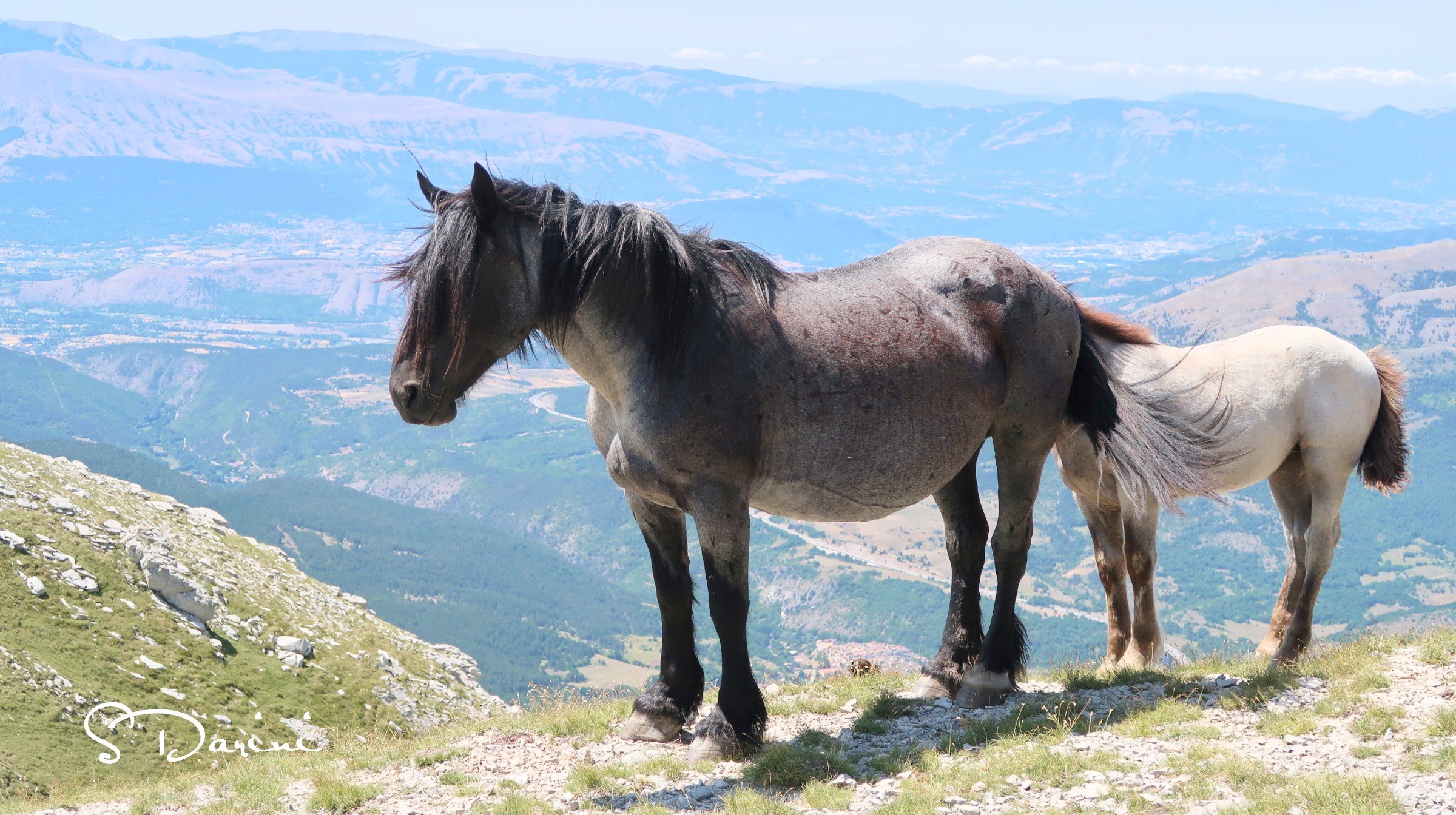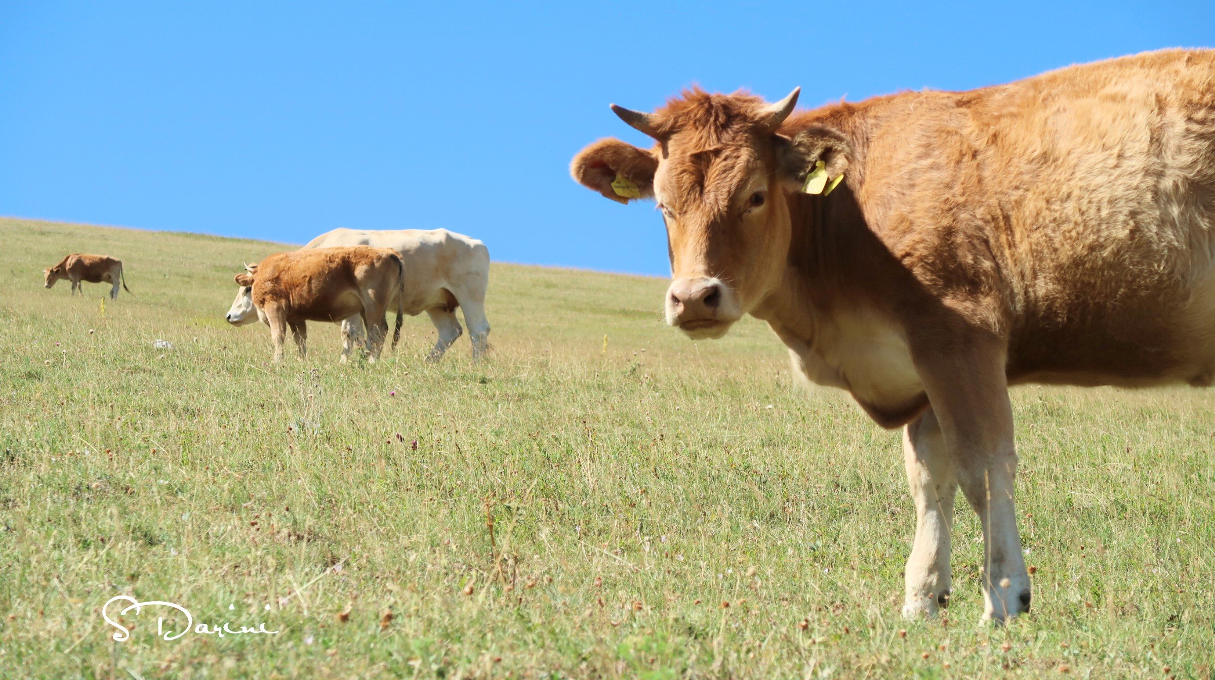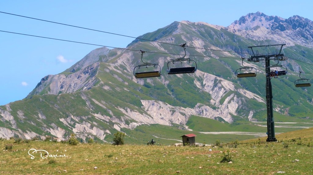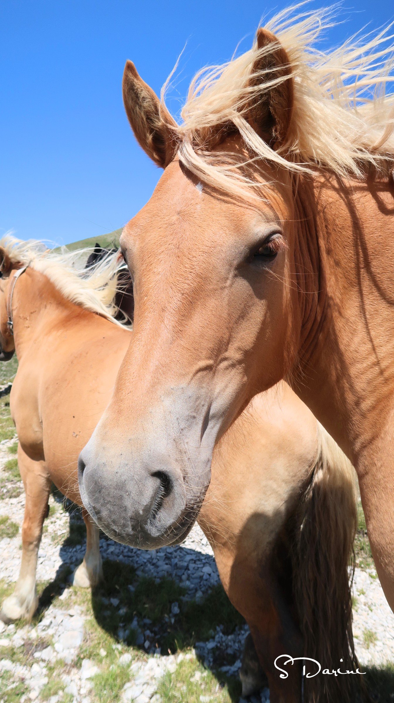La strada per raggiungere campo Imperatore si fa sempre più stretta e curvosa, il guidatore deve fare molta attenzione a non farsi distrarre dallo scenario che sta attraversando, è lo scenario di un film. Ad un certo punto non si sa più dove guardare, mucche al pascolo, laghetti, greggi di pecore con pastore e in cima lo spettacolo più emozionante, i cavalli, tanti ma davvero tanti, immobili ad osservarci mentre noi li osserviamo, nella loro immensa grazia di movimento; i puledri che prendono il nutrimento dalle loro mamme, lo stallone attento ad ogni movimento. A fare da padrone su tutto il vento, oggi fresco e forte, ma assolutamente gradevole dopo la grande afa di questi giorni.