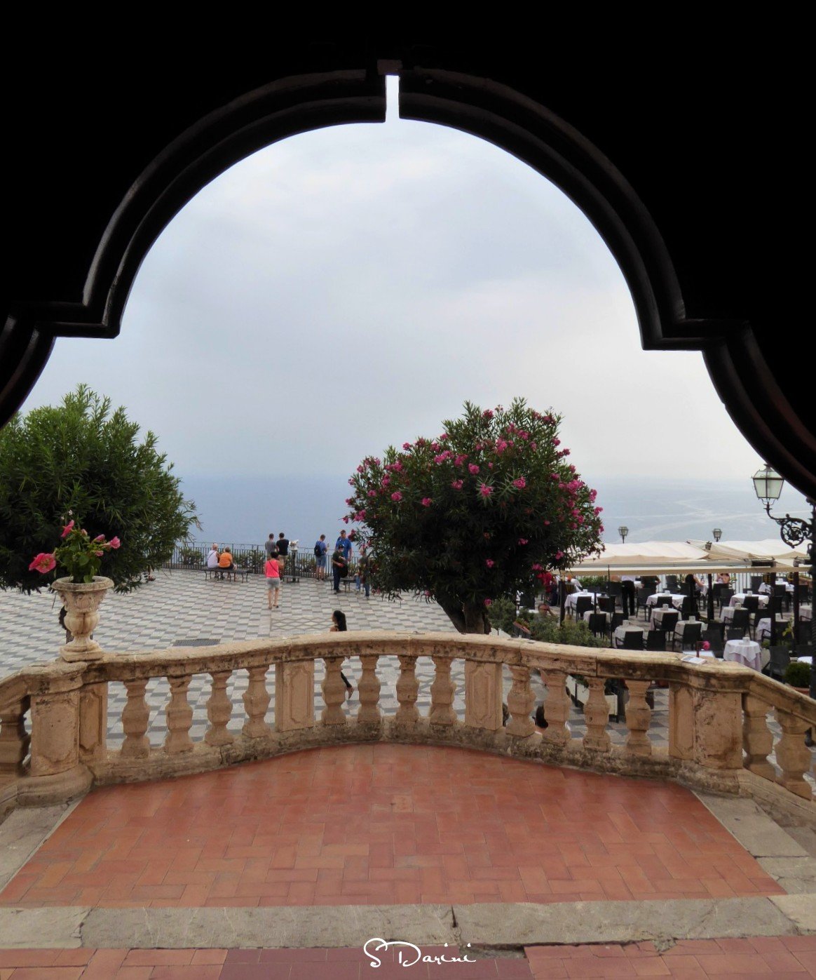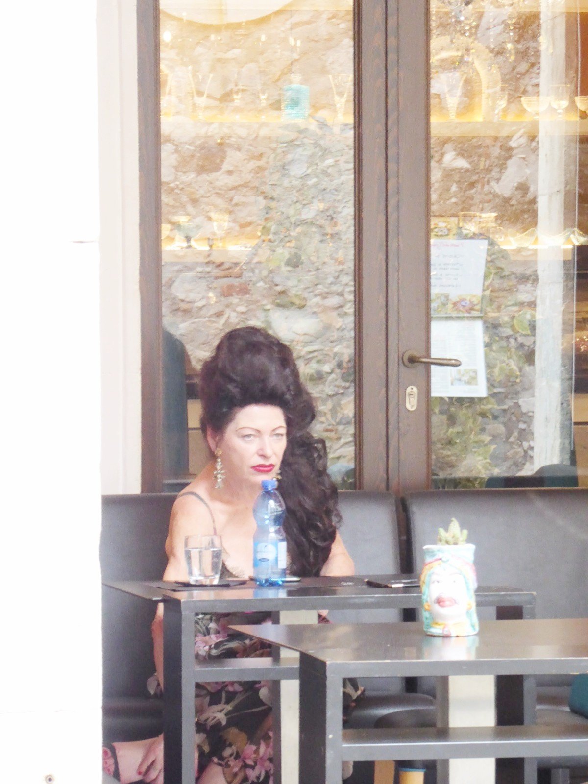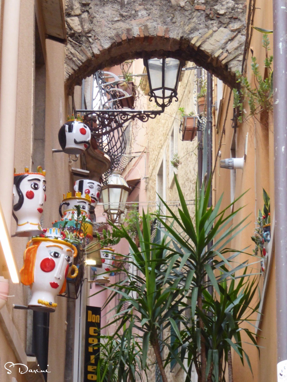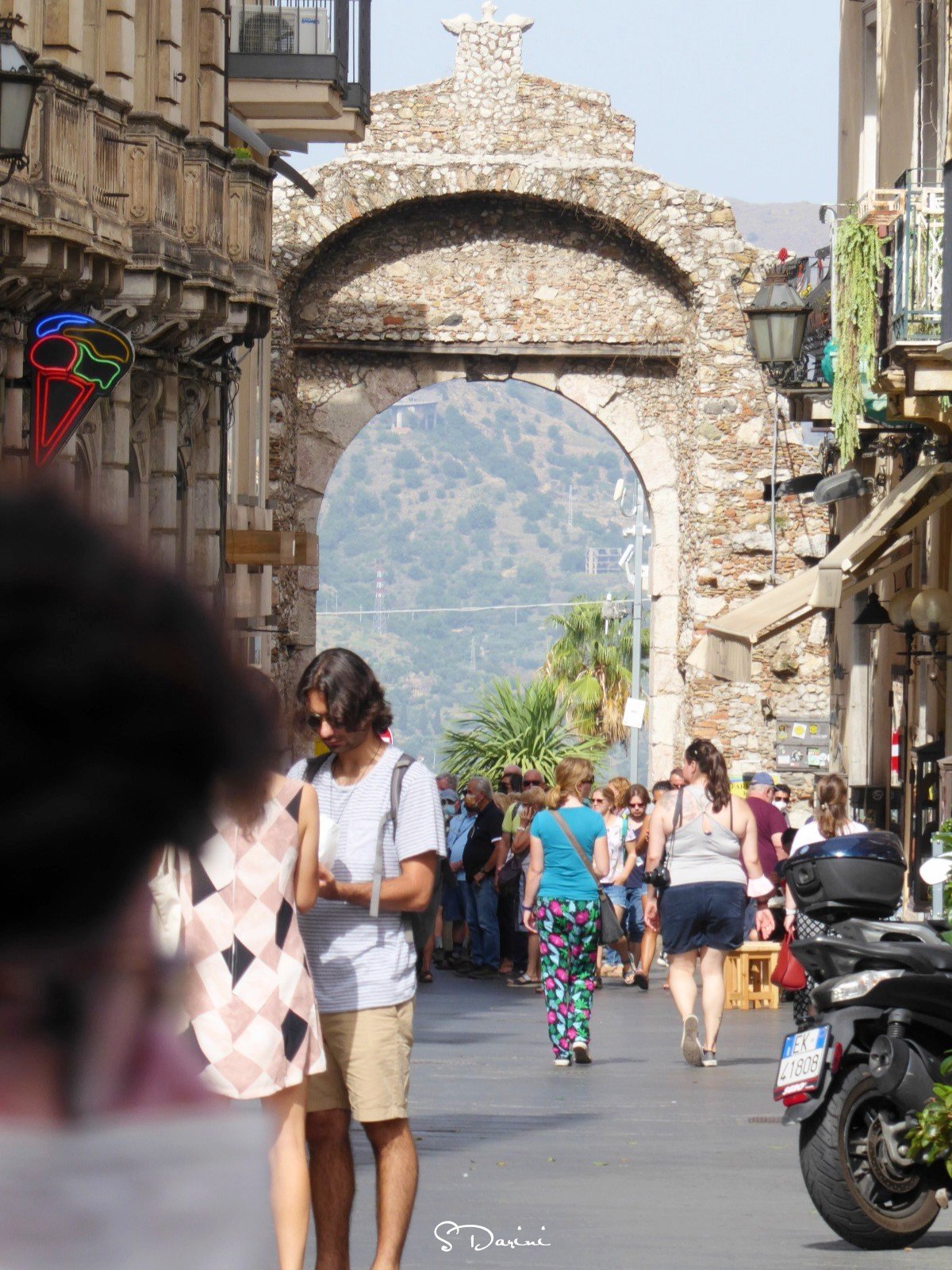 Ma quello che mi ha colpito di più di Taormina è la gente!! Affollata di turisti di ogni nazionalità. Camminando attraverso la via dello struscio, il corso, si ha la possibilità di ascoltare parlare in molte lingue, osservare le gesta e i colori dei vestiti e i negozi di ogni genere. È in una pasticceria che ci sediamo per una breve pausa. Mangiando una granita con la brioche ad osservare il passeggio e delle simpaticissime signore sedute al tavolo affianco così perfettamente colorate dalla testa ai piedi. Giriamo ancora un po tra i stretti vicoli , tra le pareti delle case addobbate di ceramiche di ottima fattura e terrazze ricche di piante verdi e rigogliose. Prima di ripartire scattiamo la nostra cartolina ricordo.