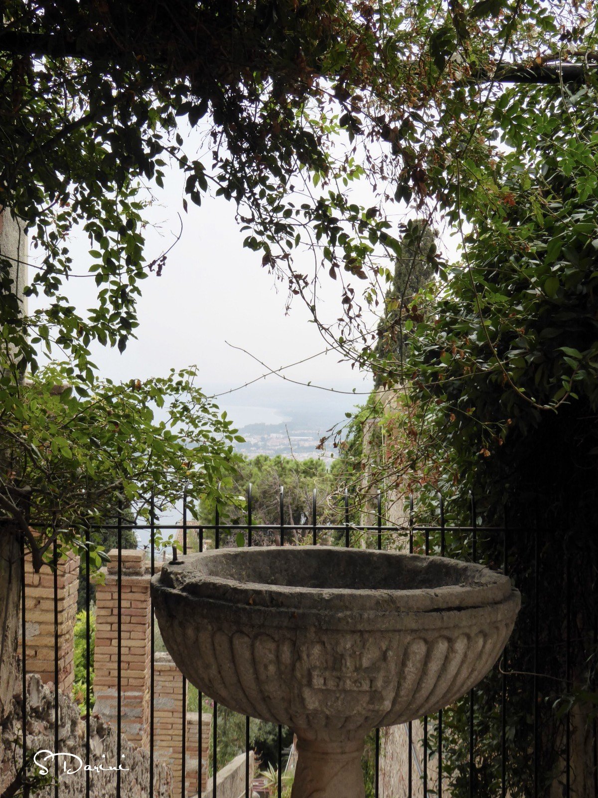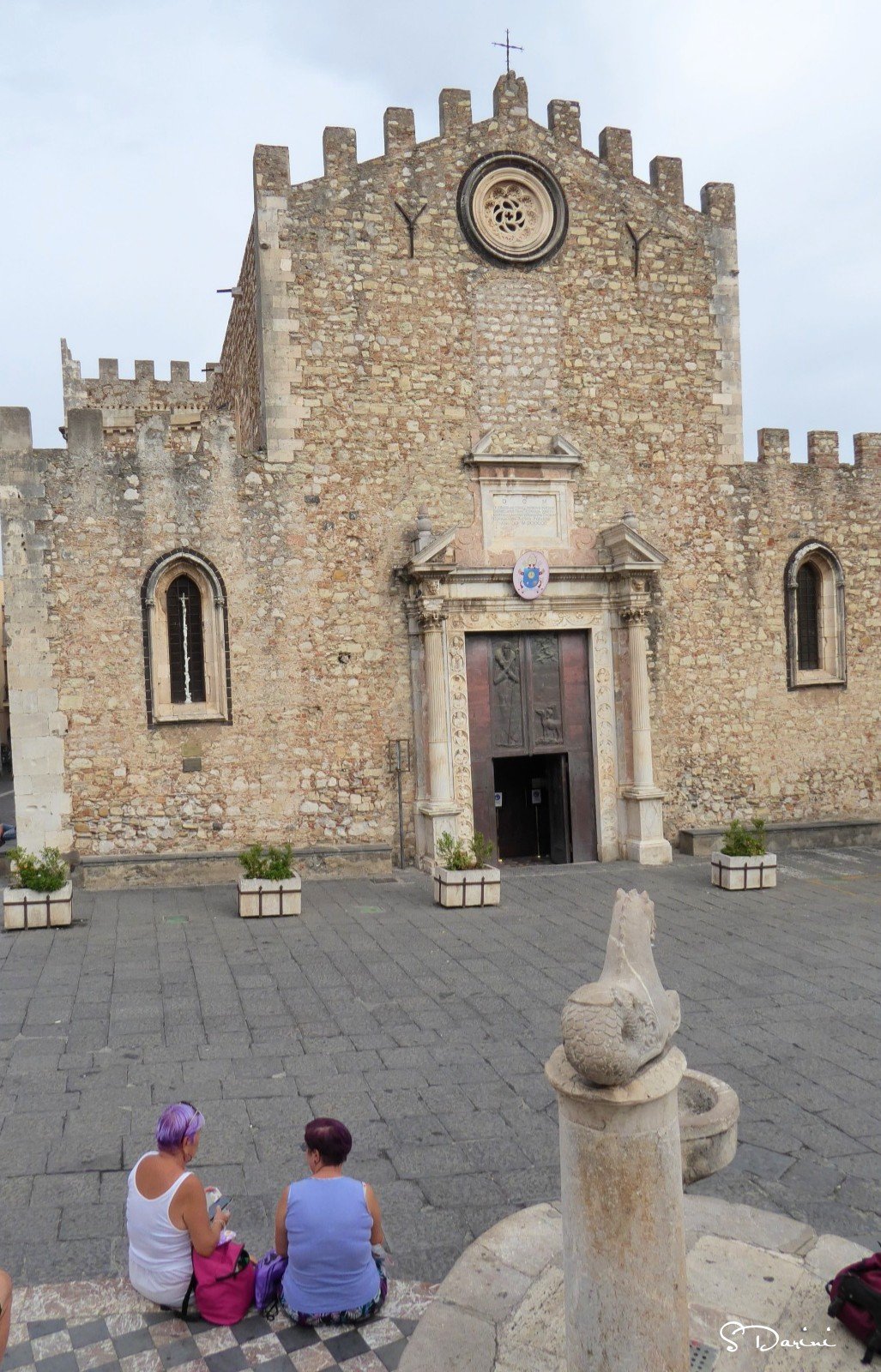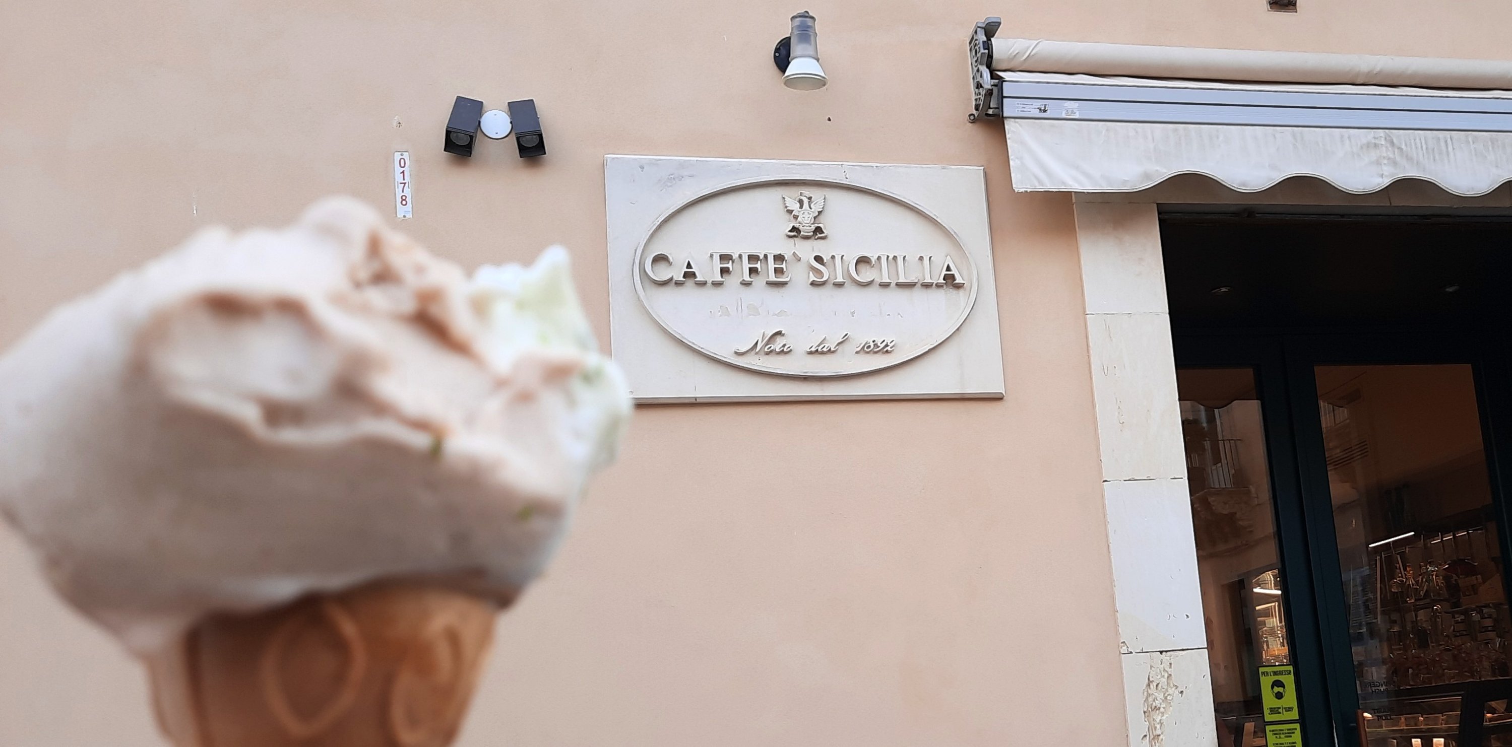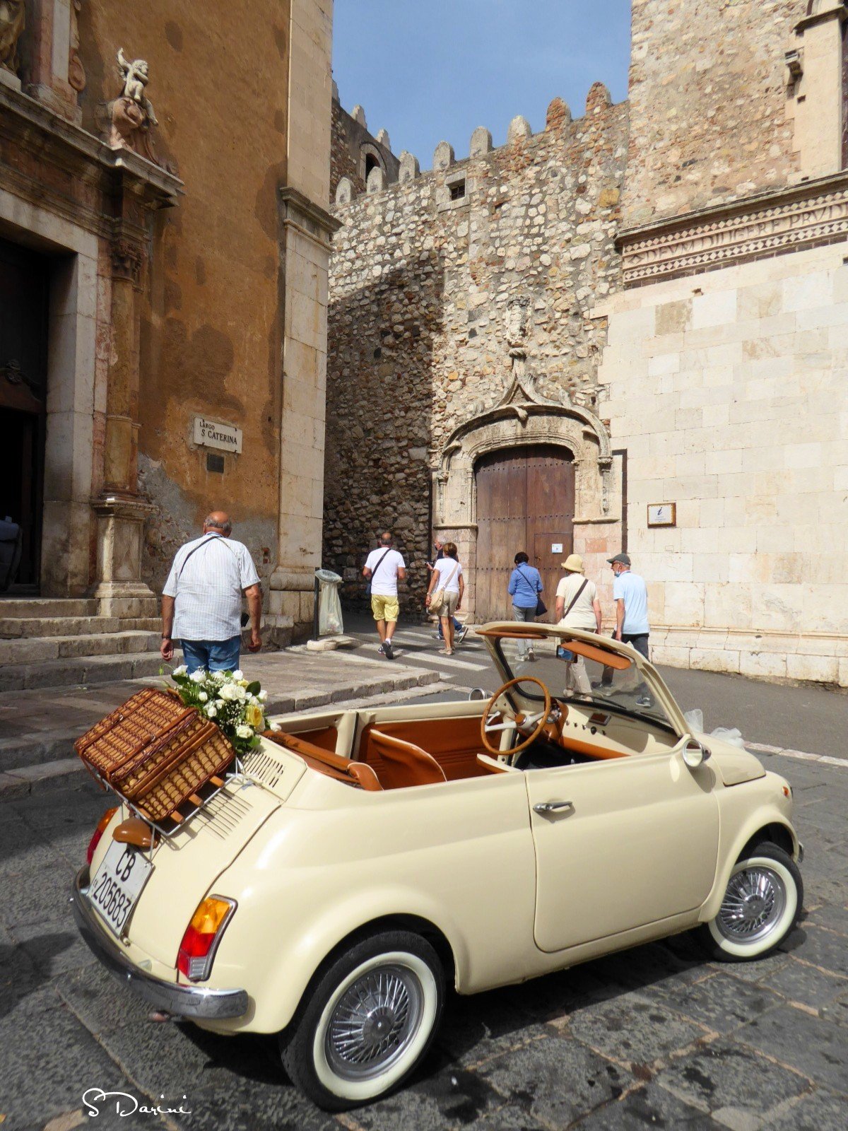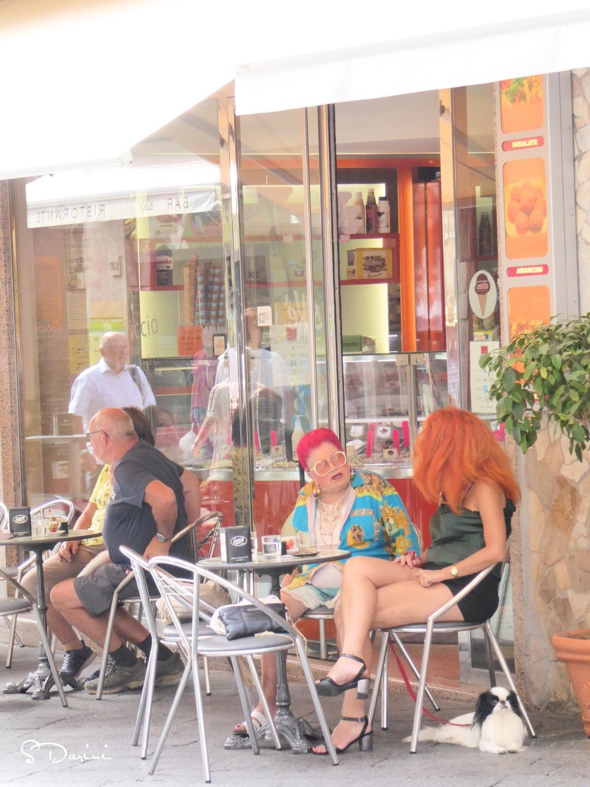 Ma quello che mi ha colpito di più di Taormina è la gente!! Affollata di turisti di ogni nazionalità. Camminando attraverso la via dello struscio, il corso, si ha la possibilità di ascoltare parlare in molte lingue, osservare le gesta e i colori dei vestiti e i negozi di ogni genere. È in una pasticceria che ci sediamo per una breve pausa. Mangiando una granita con la brioche ad osservare il passeggio e delle simpaticissime signore sedute al tavolo affianco così perfettamente colorate dalla testa ai piedi. Giriamo ancora un po tra i stretti vicoli , tra le pareti delle case addobbate di ceramiche di ottima fattura e terrazze ricche di piante verdi e rigogliose. Prima di ripartire scattiamo la nostra cartolina ricordo.