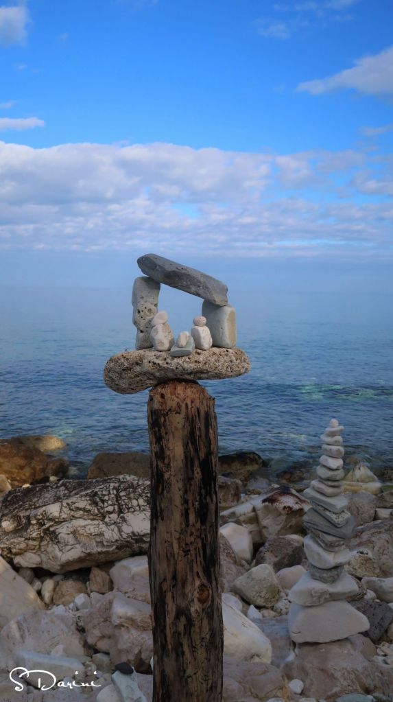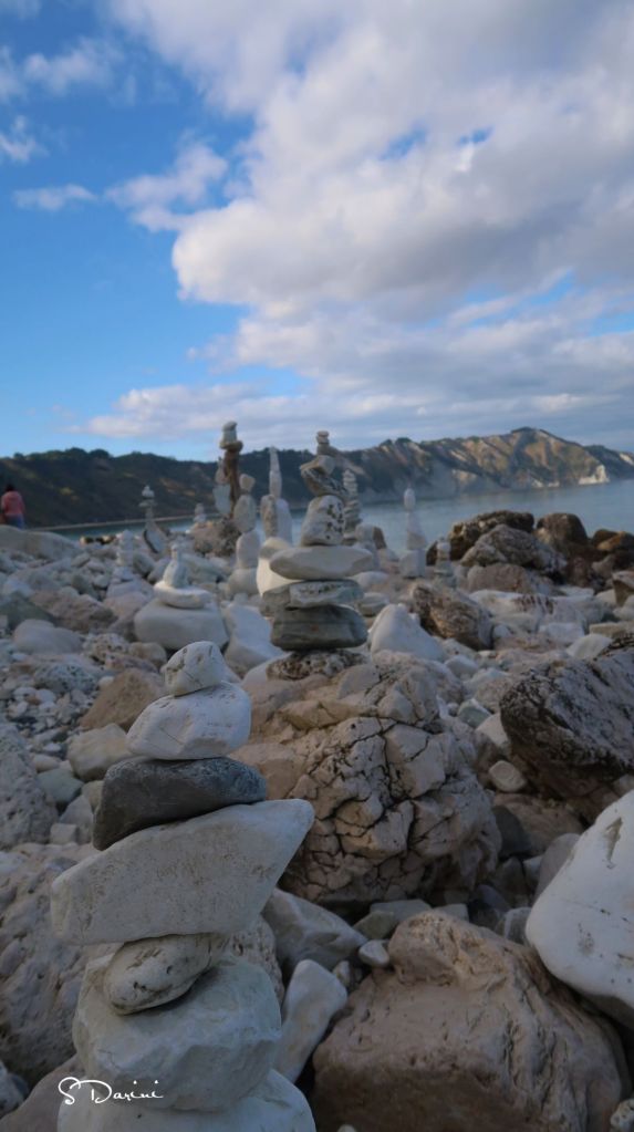 Quei colori così brillanti, le sfumature dell’acqua che cambia colore con le nuvole e il sole. Poi, le pietre, di ogni forma, di ogni sostanza, tutte diverse. Non resisto! Devo raccoglierne qualcuna, sono loro che mi parlano e mi raccontano i segreti….quelli della gente del mare!