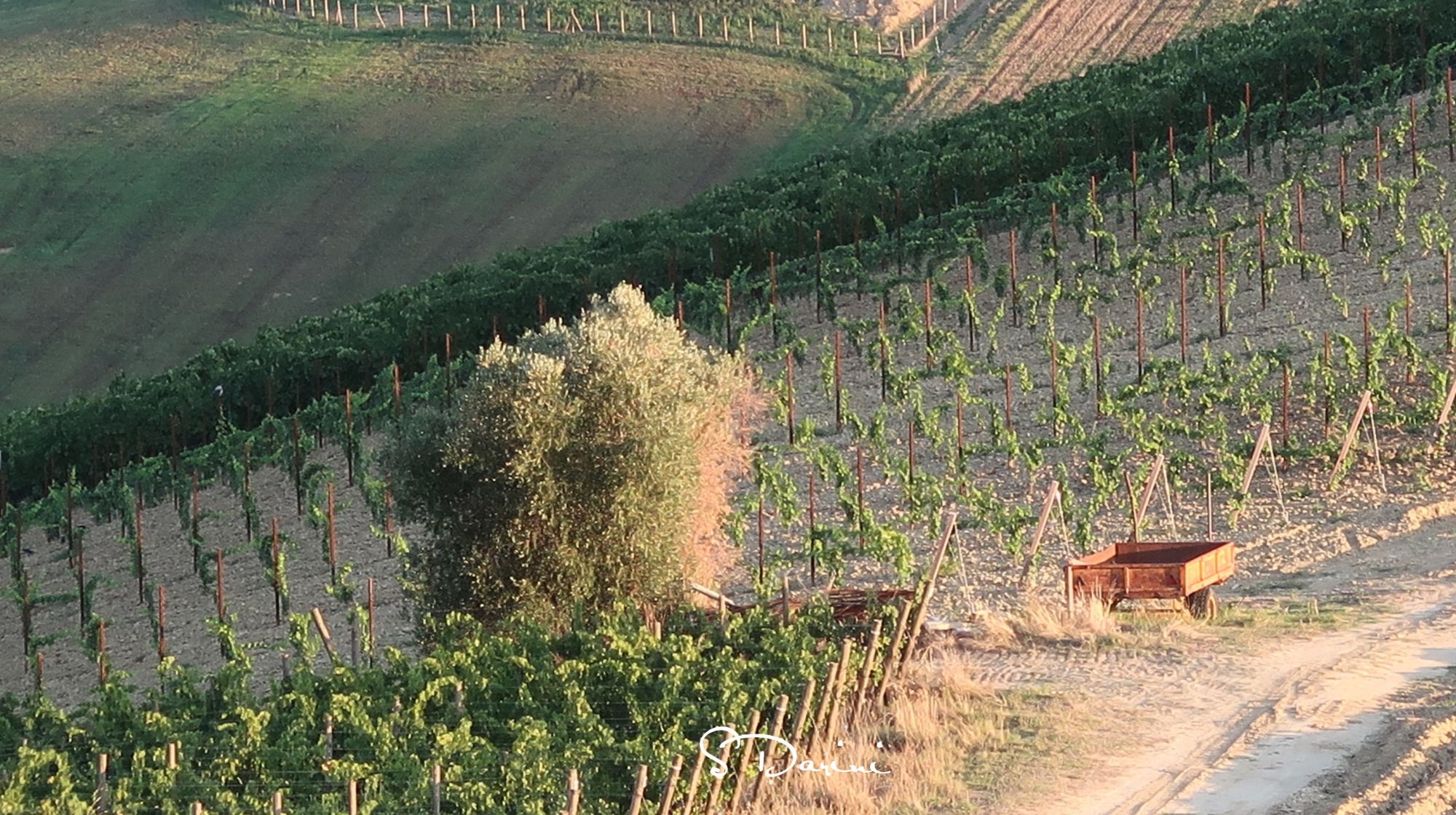 In questi giorni, prossimi alla vendemmia, le vigne profumano di fermento. I grappoli sono pesanti, i loro chicchi hanno una brillantezza speciale. Quello che più mi affascina e mi colpisce ogni volta che cammino tra le stradine che dividono i filari delle vigne, sono la loro disposizione, sembrano disegnate nelle colline, sembra che siano state sempre li.