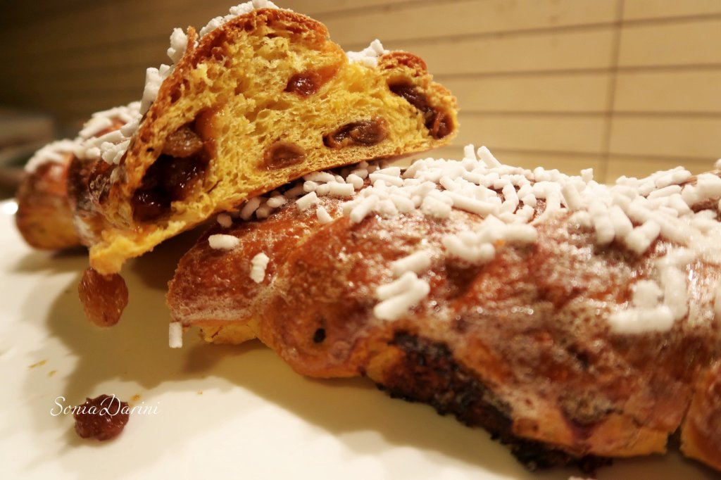 Impastare tutti gli ingredienti sopraelencati. Con una metà di pasta ho realizzato la treccia. Ho steso con il matterello, diviso in tre strisce, al centro di ognuna ho sistemato l’uva passa, richiuso ed intrecciato. Ho fatto lievitare coperta per 1 ora e cotto a 180° per 45 minuti. A fine cottura ho spennellato la superficie con albume battuto con lo zucchero e guarnito con granella di zucchero.