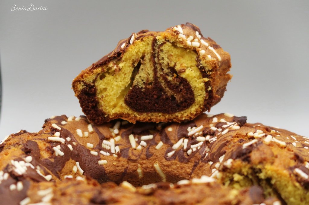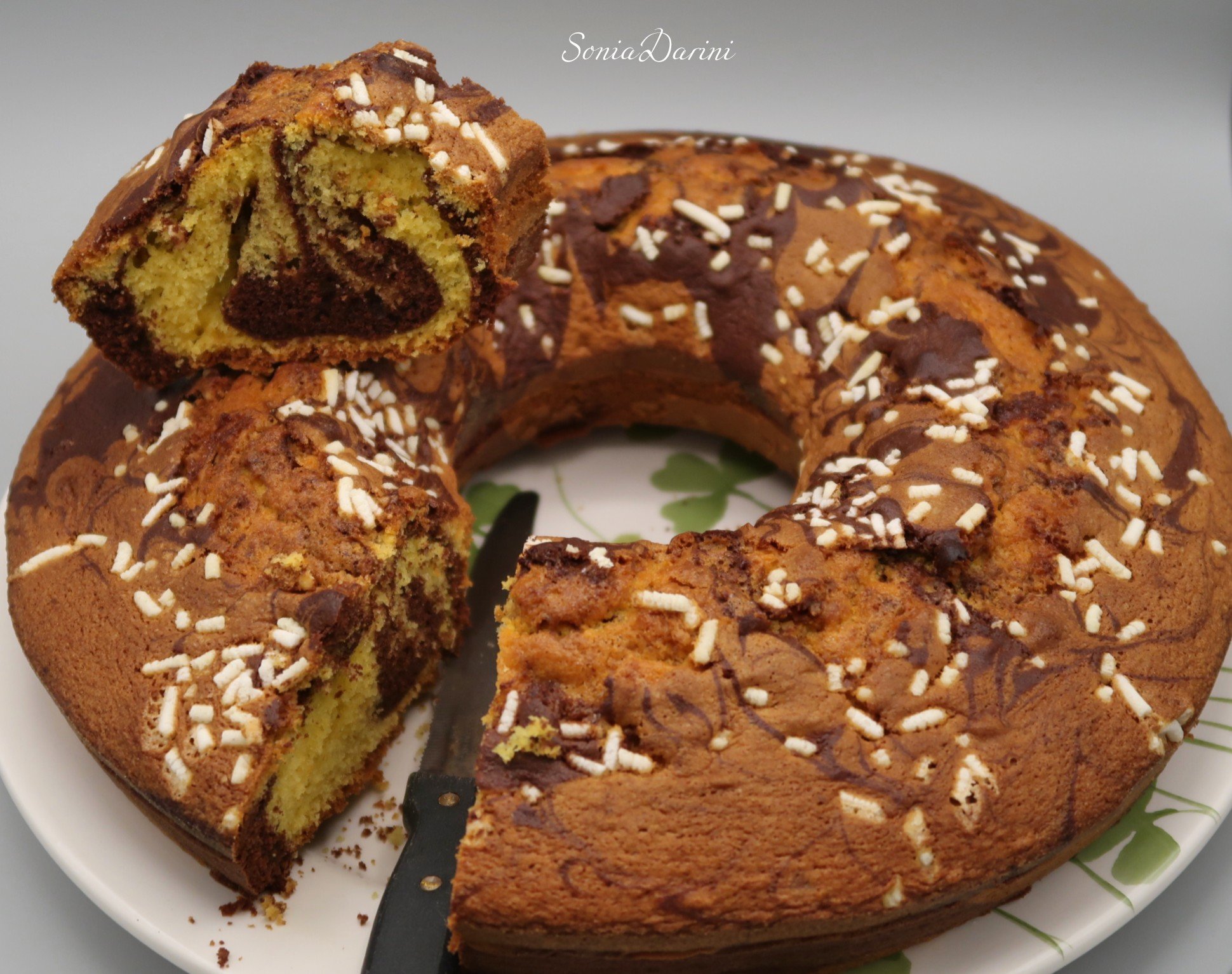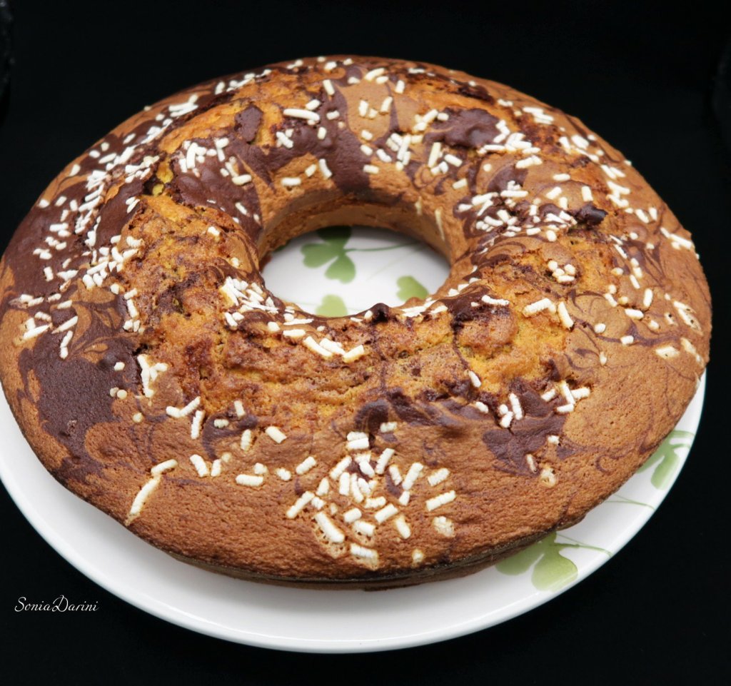 In un robot o planetaria sbattere le uova con lo zucchero fino a renderle spumose. Aggiungere, sempre continuando a sbattere, il burro morbido a temperatura ambiente, la farina setacciata al lievito, il latte, il rum. Dividere il composto in due. In una parte, aggiungere il cacao leggermente mescolato a un cucchiaio di latte per evitare grumi. Prendere uno stampo a vostro piacere, rotondo o lungo, importante che il contenuto non superi la metà. Imburrare ed infarinare lo stampo prescelto e versare i due composti a strati. Alla fine, aiutandovi con uno stecchino o forchetta, striate il composto. Spolverare con zucchero semolato o zucchero in granella o nocciole tritate senza pelle. Cuocere in forno ventilato preriscaldato alla temperatura di 180° per 30 minuti circa, vale sempre la prova stecchino.