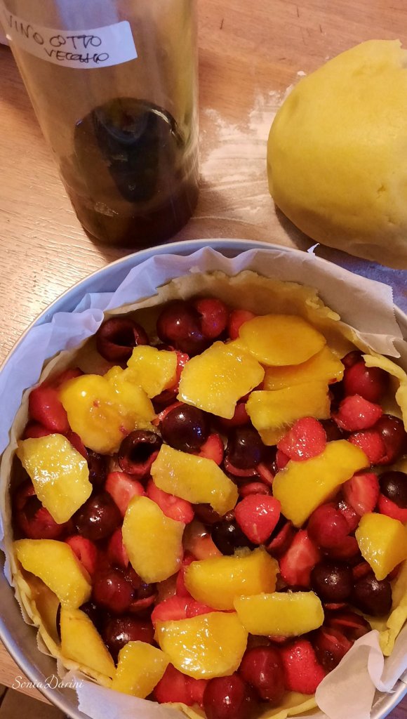 Riprendere la frolla e dividere a metà. Stendere una metà con cui foderare lo stampo ricoperto di carta forno. Spennellare con il vino cotto, versare la frutta, livellare e ricoprire con l’altra metà di pasta frolla stesa. Spennellare con vino cotto e spolverare con zucchero di canna. Infornare a forno caldo, alla temperatura di 180° per 40 minuti.