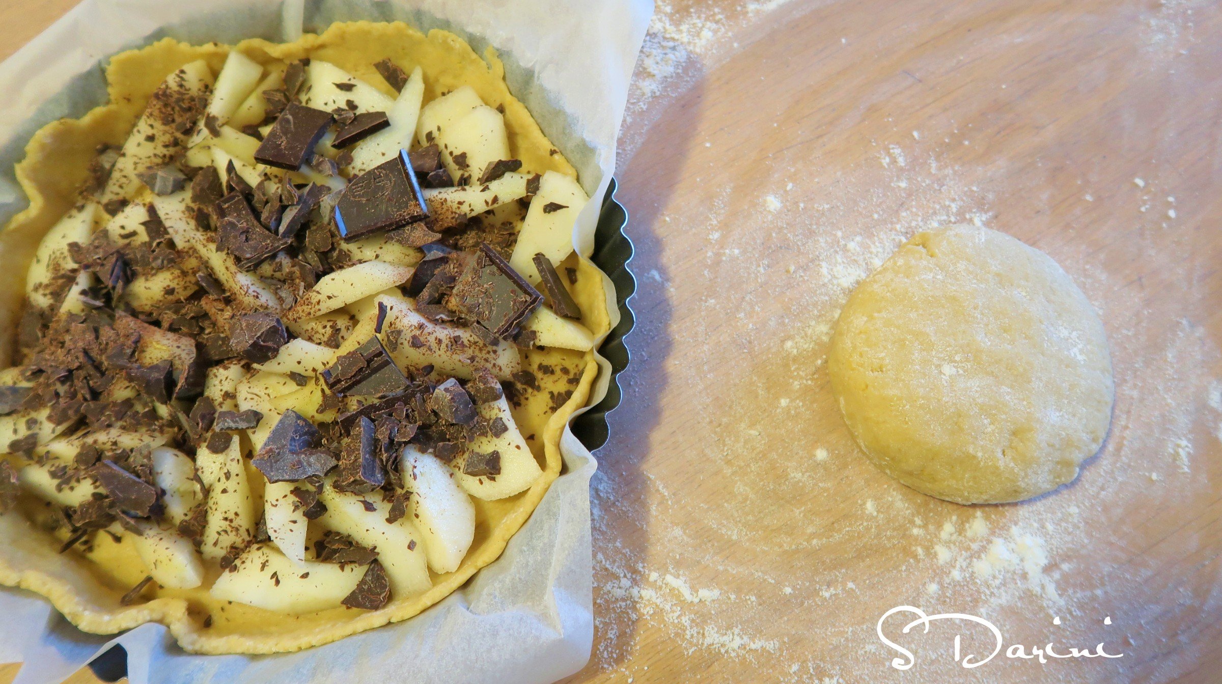 Versare in una ciotola la farina, il lievito, lo zucchero, il burro a pezzettini e temperatura ambiente. Mescolare ed aggiungere i rossi d’uovo. Se l’impasto risulta troppo asciutto e sbricioloso, aggiustare con il latte. Impastare, dividere in due. Sbucciare e tagliare a pezzi di grandezza media le pere. Spezzettare il cioccolato. Stendere metà impasto in un disco di circa 26 cm di diametro e sistemarlo in uno stampo per crostata. Sistemare sopra i pezzi di pera e il cioccolato in maniera abbastanza uniforme. Coprire con l’altro disco di pasta e sigillare i bordi.