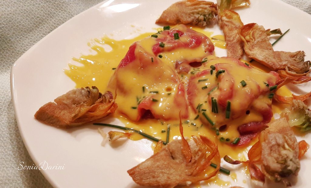 Lo Chef decide di proporre questo piatto ad una cliente abituale, la contessa Amalia Nani Mocenigo, alla quale il medico aveva proibito di mangiare carne cotta. Correva l’anno 1950 e a Venezia si stava allestendo una mostra di Vittore Carpaccio, il celebre pittore del Rinascimento, famoso per gli accesi contrasti di rossi e gialli brillanti che caratterizzavano i suoi quadri. Da qui, nasce il nome del piatto.