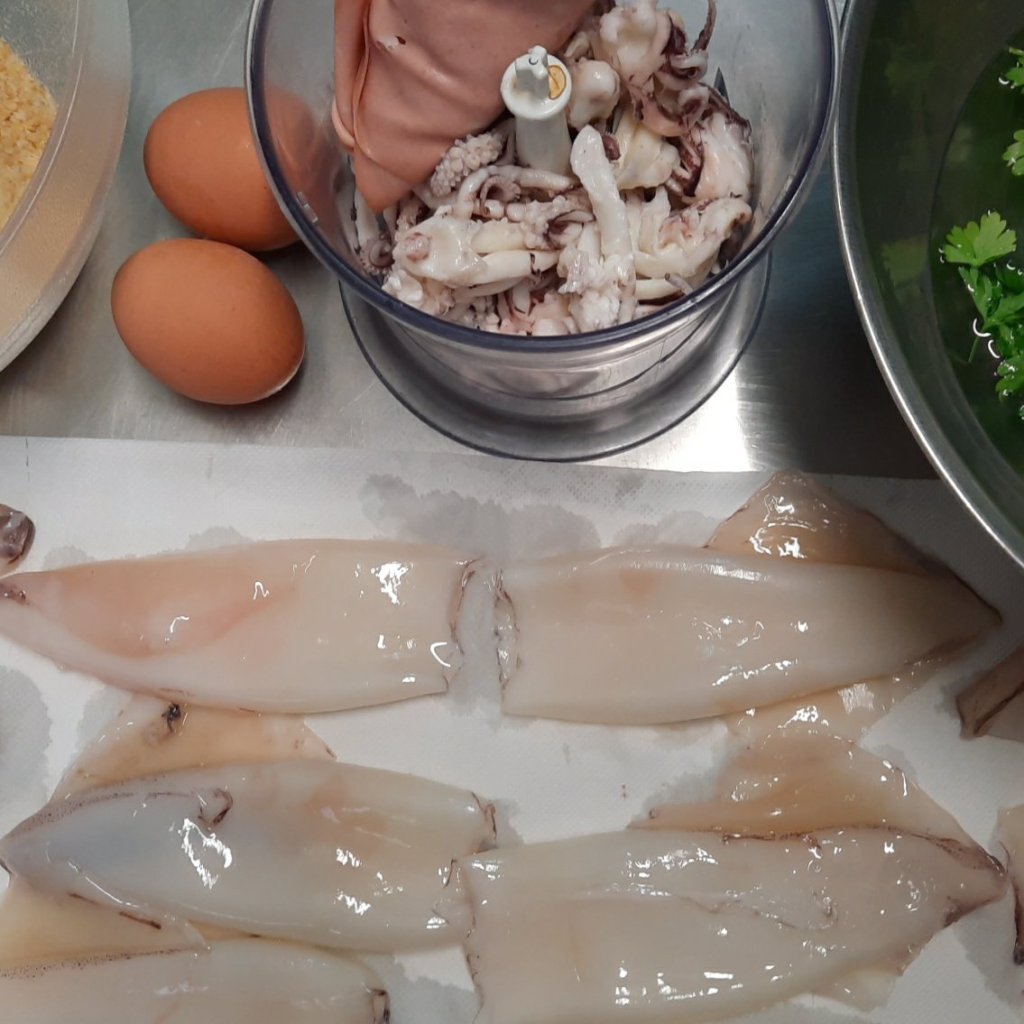 Pulire i calamari, sbollentare le teste per pochi minuti e lasciar raffreddare. Tritare nel mixer le teste, il prezzemolo, la mortadella e l’aglio ( facoltativo). In una ciotola, battere le uova con qualche cucchiaiata d’acqua e versare il pane grattugiato, mescolare ed aggiungere il composto tritato. Regolate di sale e una macinata di pepe( facoltativo). Riempire, aiutandovi con un sac-a-poche, ci corpi dei calamari fermando con uno stecchino. In una capiente padella, versare un filo d’olio e il pomodoro privato della pelle a pezzettini piccoli, aggiungere un pizzico di sale. Sistemare i calamari farciti nella padella con il pomodoro, mettere sul fuoco, prima medio, poi, appena inizia il bollore, abbassare e coprire. Cuocere il tempo necessario, dipende molto dalla morbidezza dei calamari, infilzandoli con la forchetta, vi renderete conto se sono pronti.