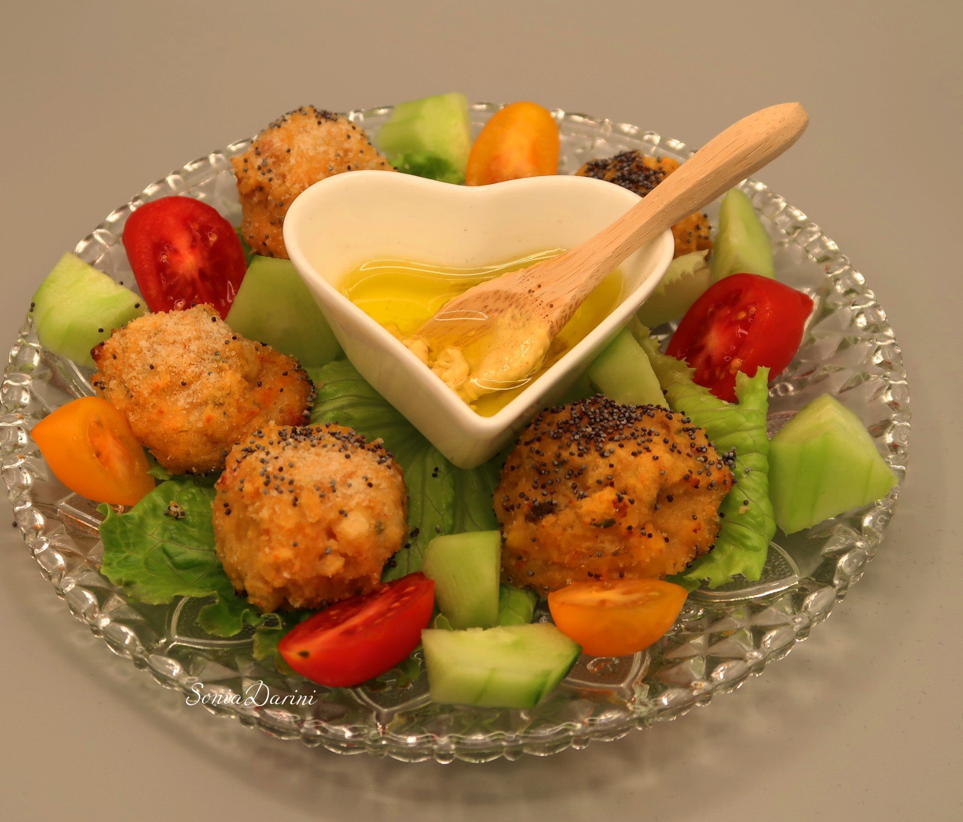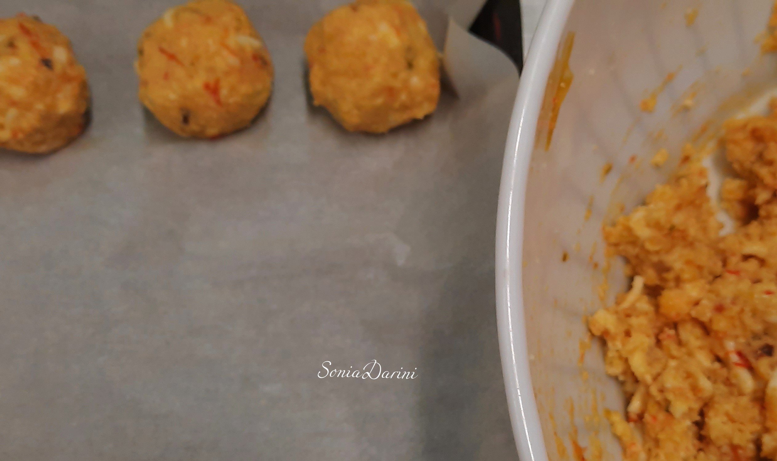 Impastare tutti gli ingredienti insieme e formare delle polpette. Imparare con solo pane grattugiato. Disporre le polpette su una teglia da forno leggermente oleata e cuocere a 200°per circa 20 minuti. A metà cottura girare.