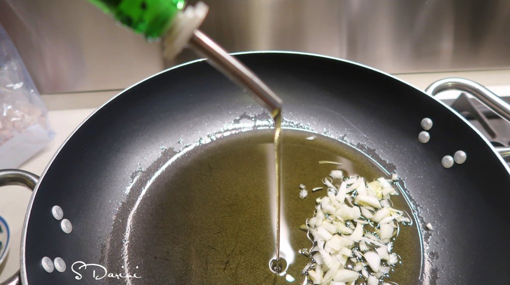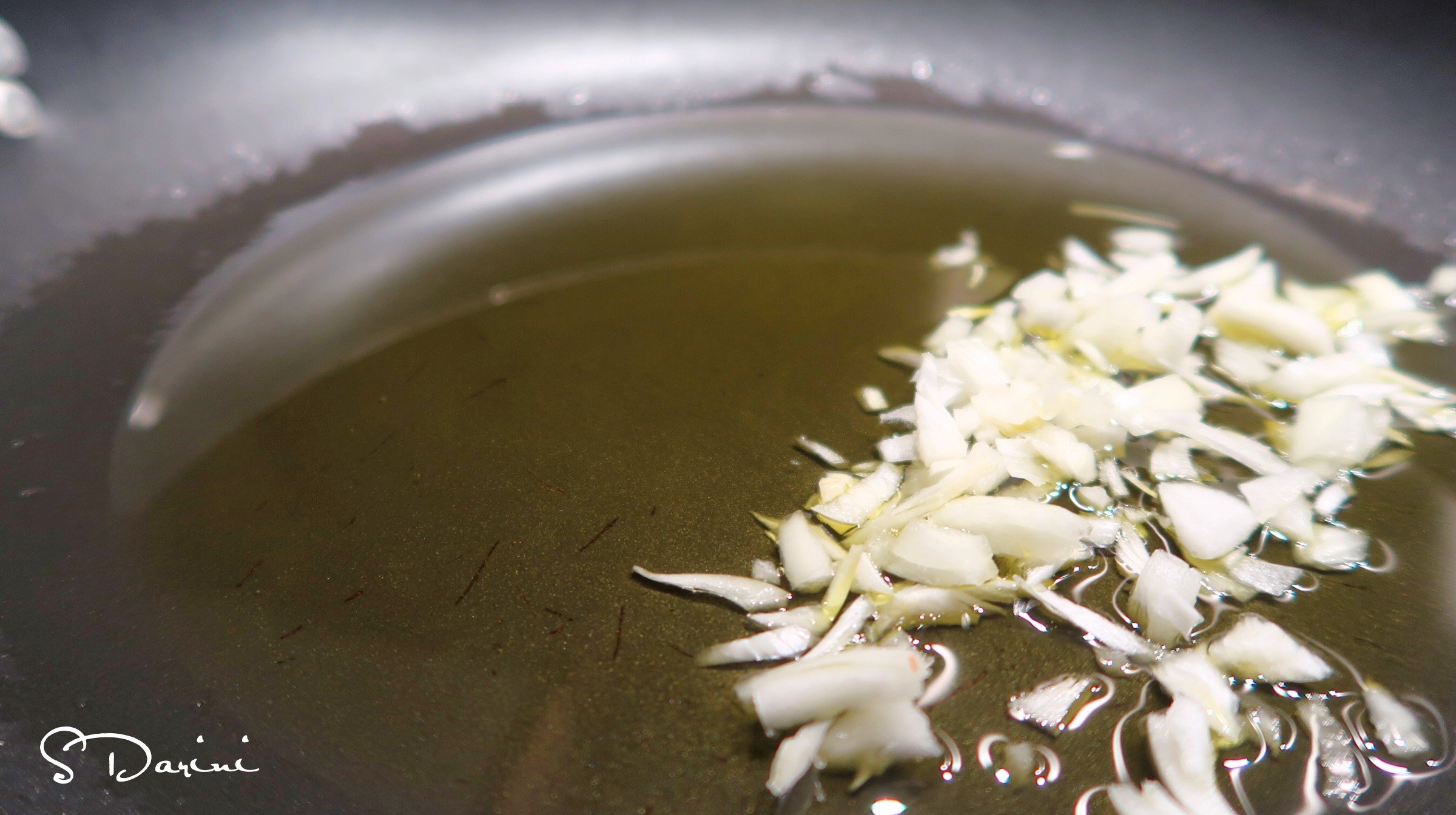 Su una larga padella dai bordi alti versare l’olio e la cipolla tritata.