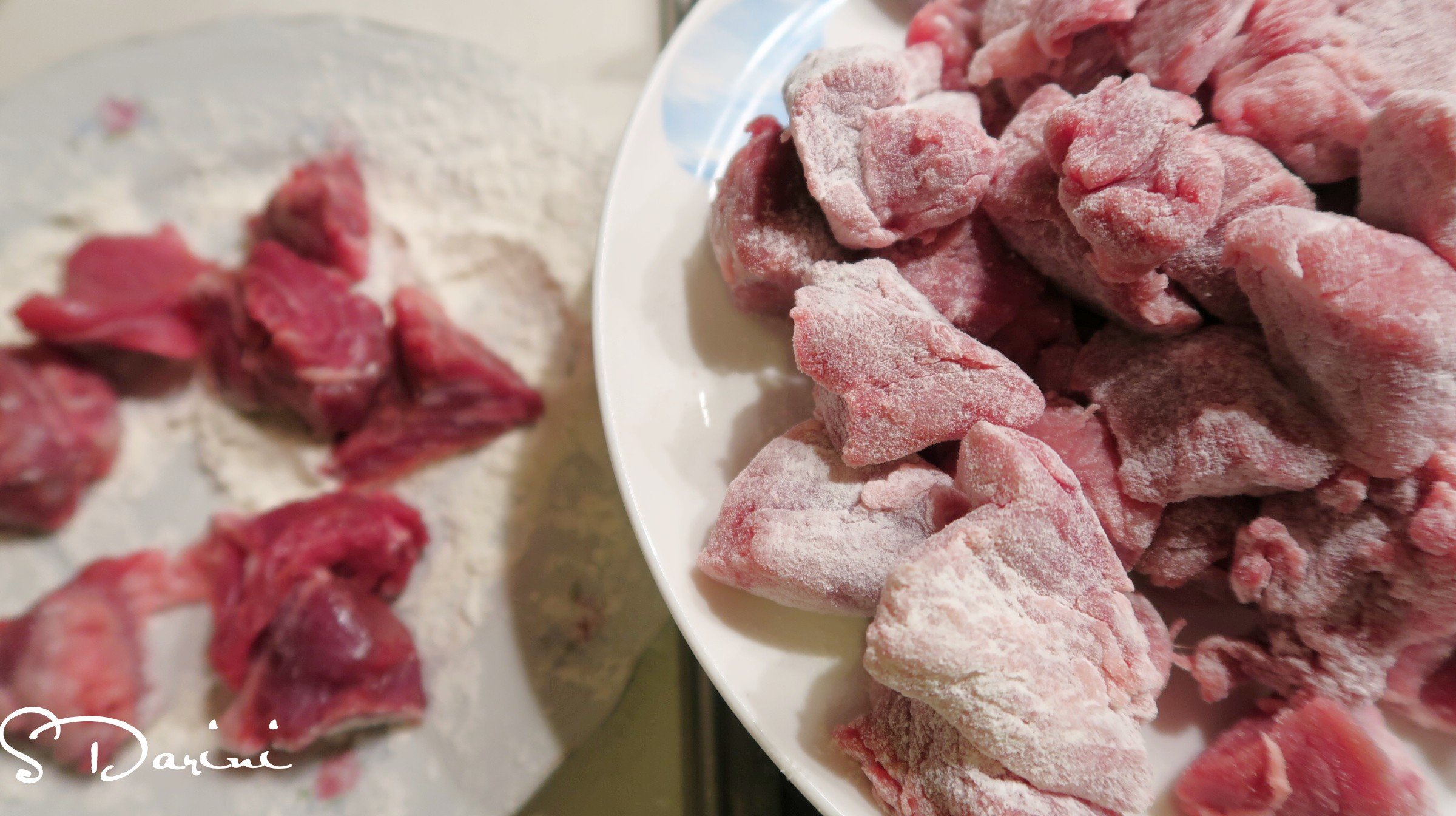 Infarinare la carne ben asciutta facendo attenzione a togliere la farina in eccesso