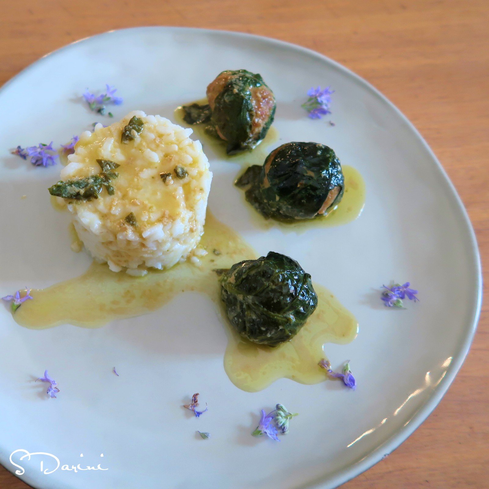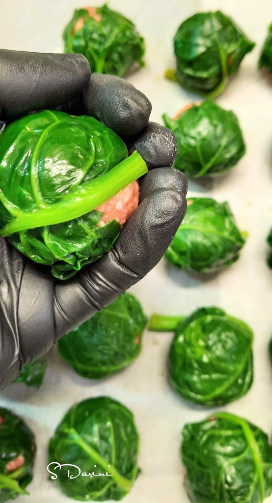 In una ciotola impastare tutti gli ingredienti, aggiustare di sale. Con le mani leggermente bagnate, formare le polpettine ed avvolgerle nelle foglie di spinaci leggermente sbollentate e buttate in acqua e ghiaccio per non far perdere il colore.
